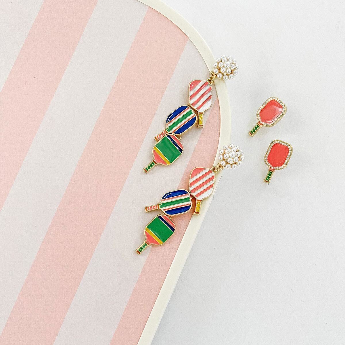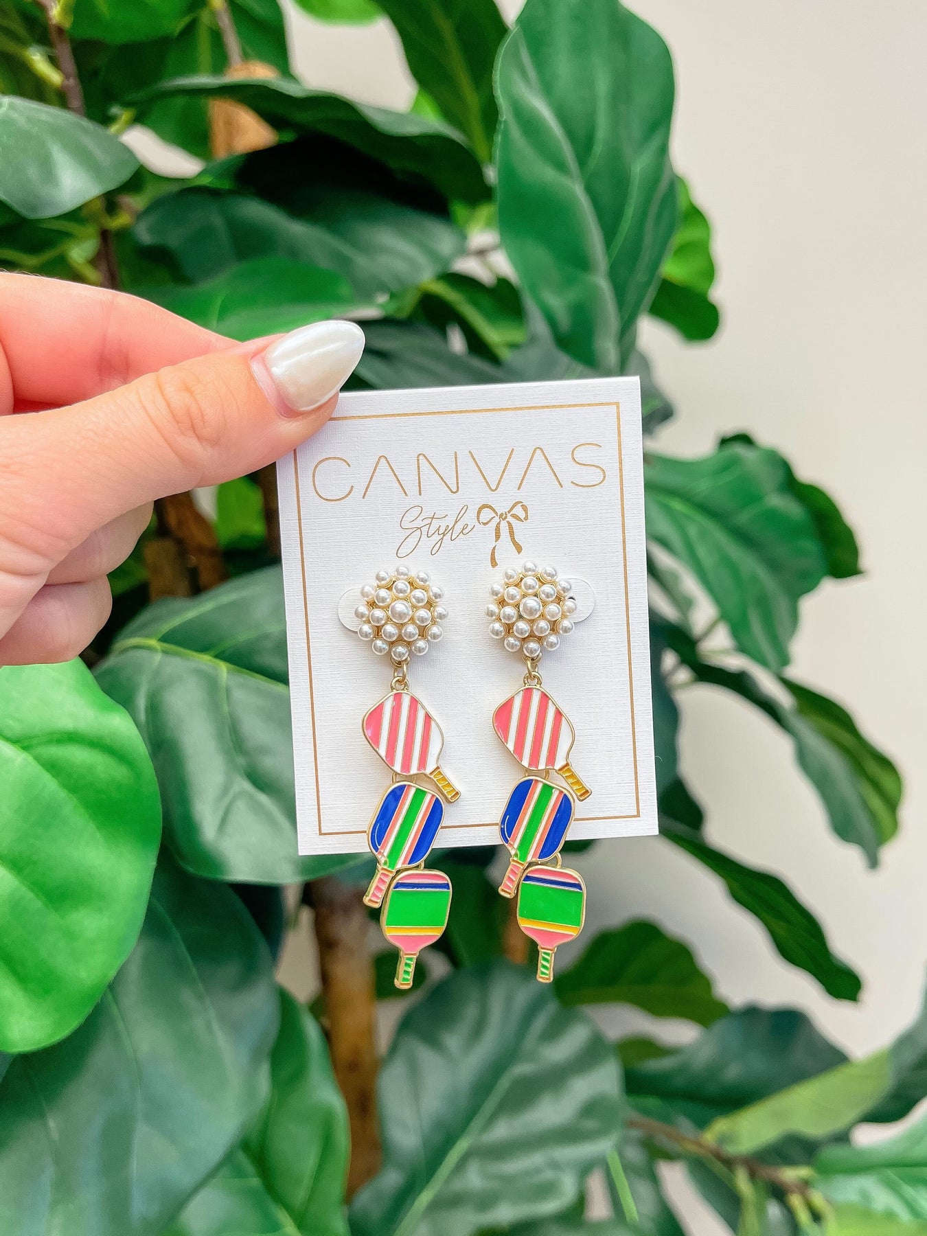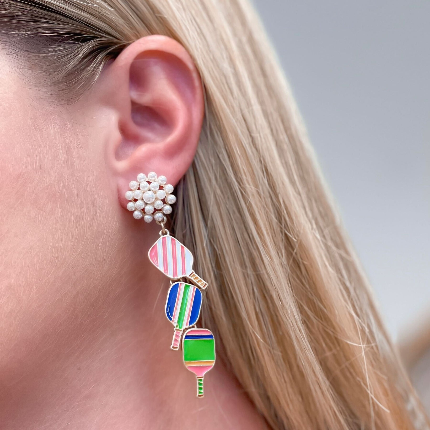 Serve up a little style with our Ellie Pickleball Triple Linked Pearl Cluster Drop Earrings! Get ready for game time in these vibrant multi-colored earrings that feature fun and feminine designed paddles to show off your love for the sport.