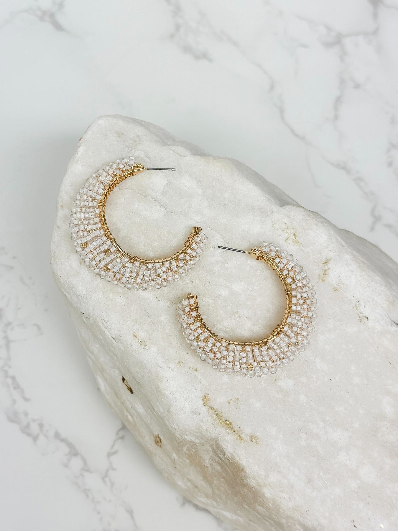 Introducing our Beaded Cluster Open Hoop Earrings. These earrings feature a classic hoop design with beaded detailing, adding a touch of unique style to any outfit.