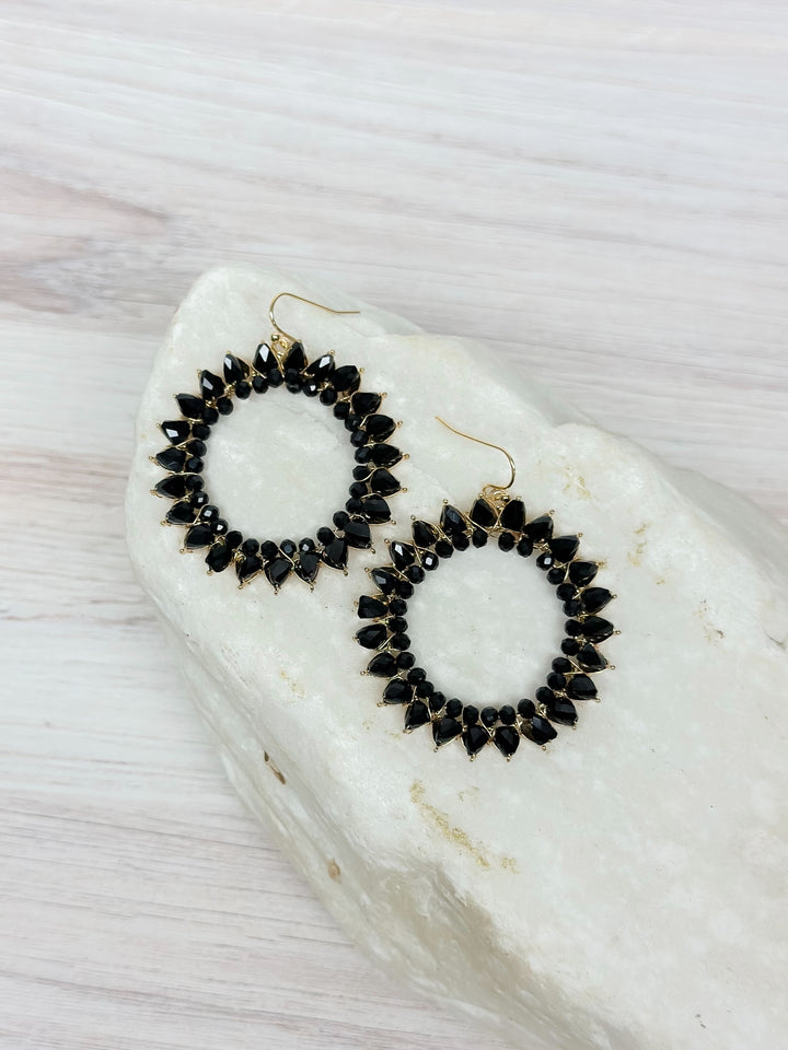 Add a touch of sparkle and sophistication to your ensemble with these Open Circle Beaded Dangle Earrings in Jet. The open circle hoop design is adorned with shimmering black gems, creating a unique and stylish look. Perfect for adding a touch of edgy elegance to any outfit.