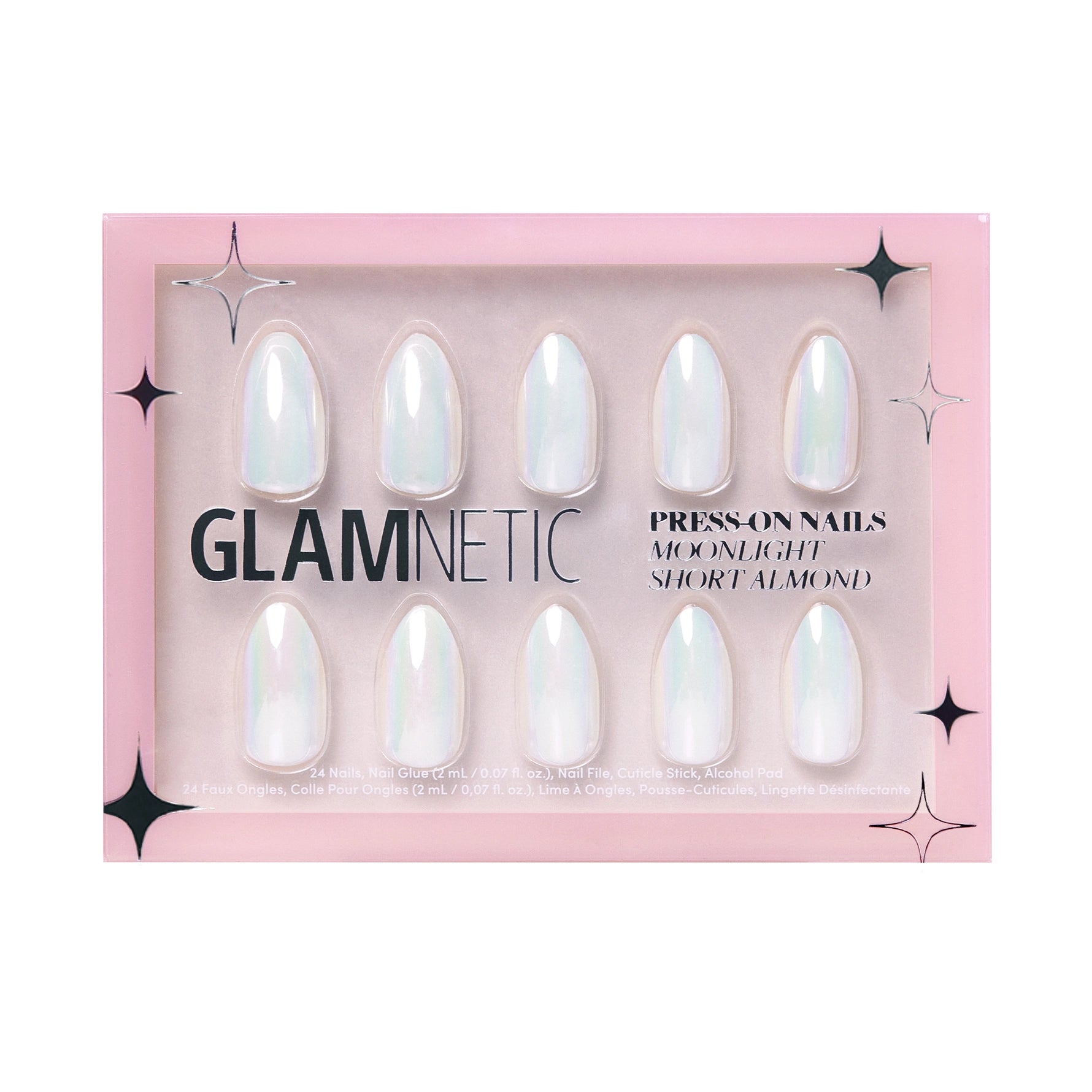 Press on nails that are intuitive, trendy, & simplify the beauty routine. Carry the beauty of the sparkling moonlight with you when you wear these pearlescent white nails. Each short, almond shaped nail in this set is crafted to be effortlessly applied and naturally shaped to match the look and feel of your genuine nail. The starlight-like glow of this set is sure to brighten up any daytime or evening event. The high quality material they are made from is engineered to provide a damage-proof protection with every wear. When applied correctly, these nails are able to last for up to 2 weeks straight depending on your lifestyle.