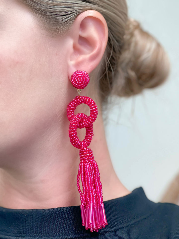 Seed Bead Linked Tassel Earrings - Hot Pink
