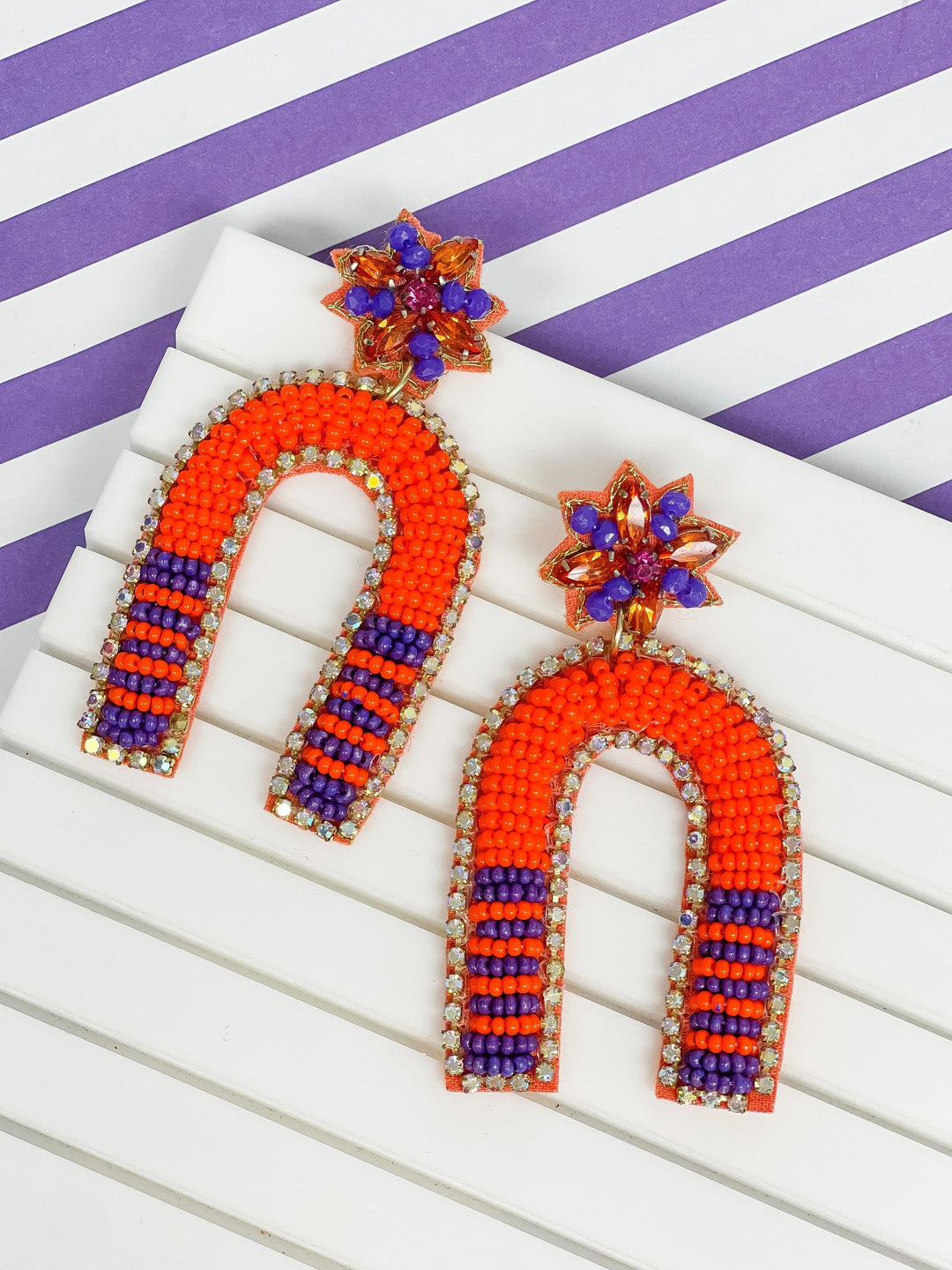 Game Day Beaded Arch Dangle Earrings - Orange & Purple