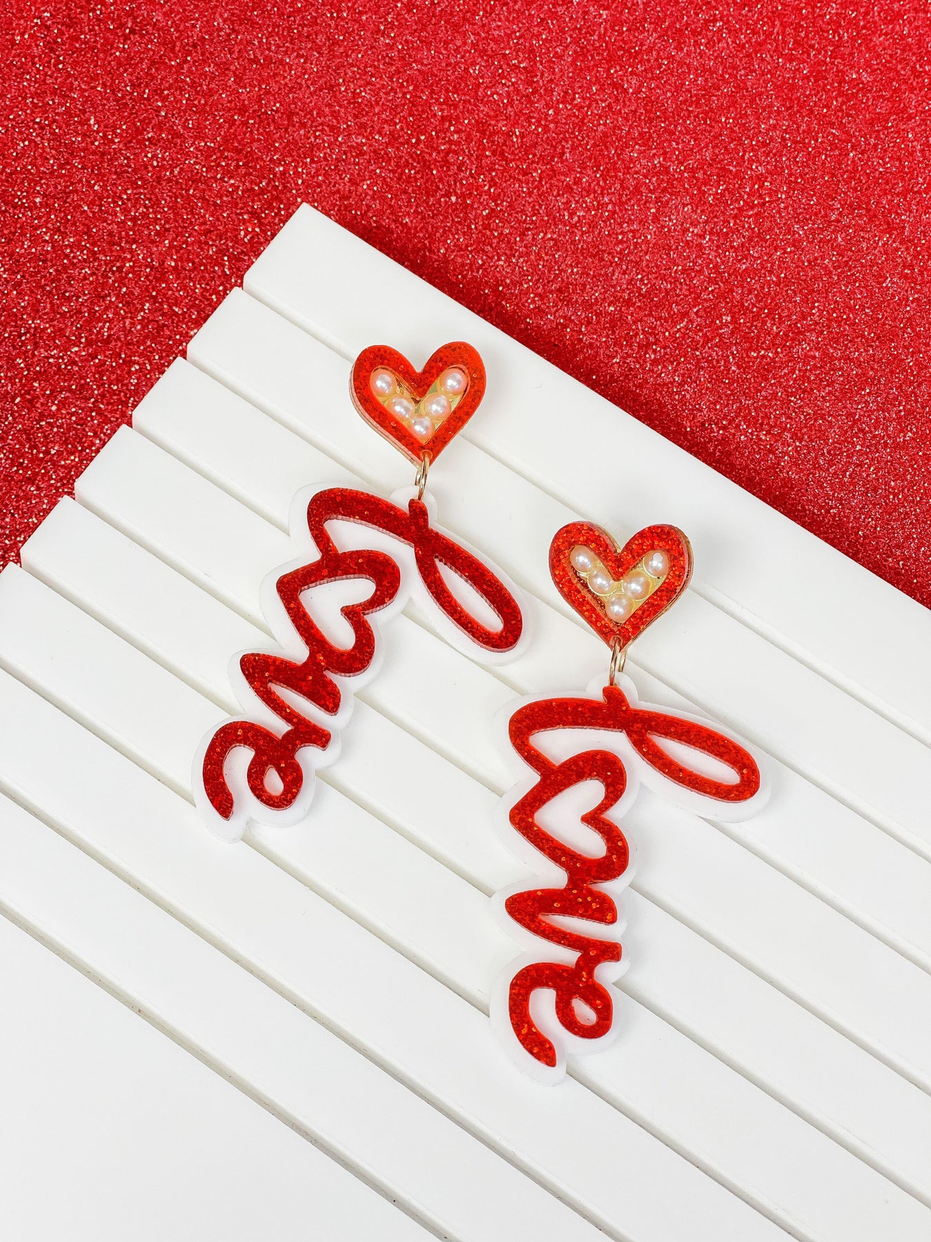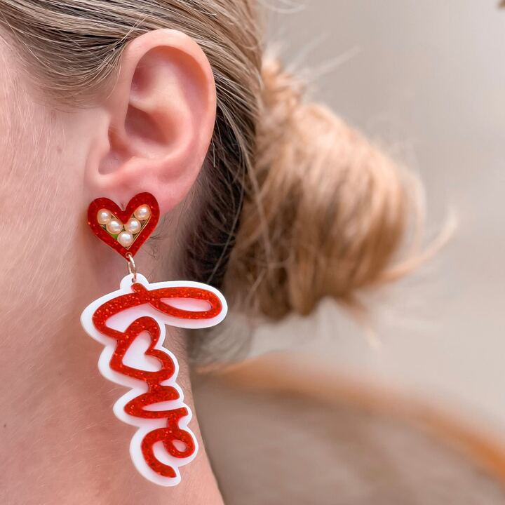 Add a touch of love and glamor to any outfit with our 'Love' Pearl & Glitter Dangle Earrings.