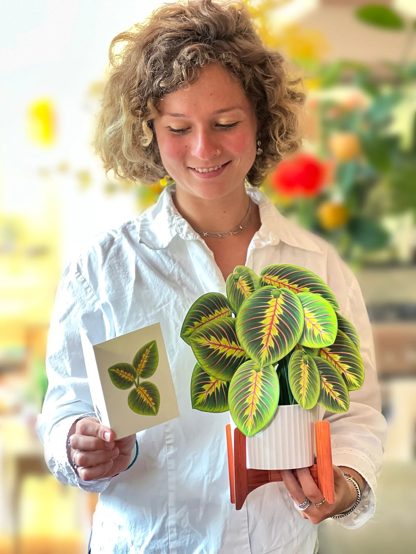 This flashy foliage, a member of the Maranta genus, coined its name as “Prayer Plant" because at night its leaves fold up towards the sky, symbolic of hands in prayer. This lush display of striking patterned leaves comes complete with a modern white planter and mahogany wood stand.