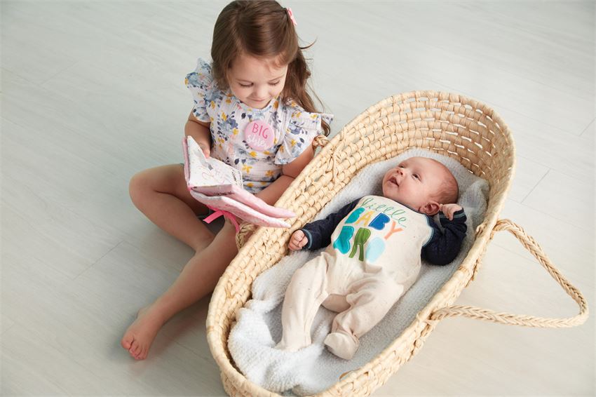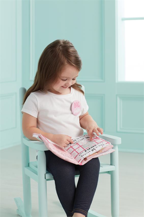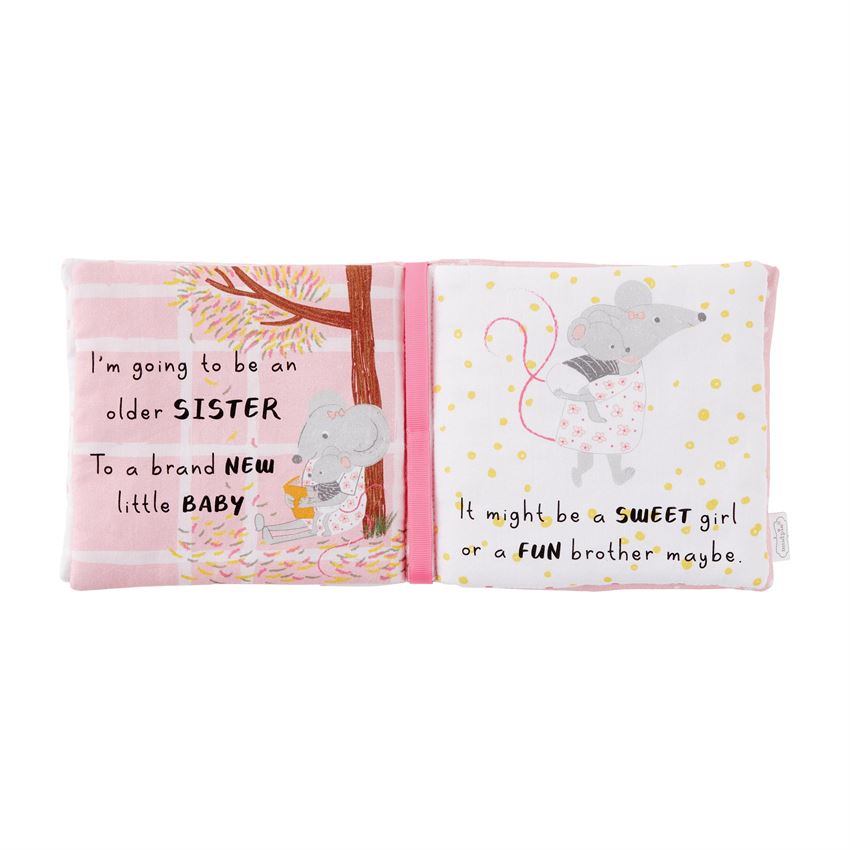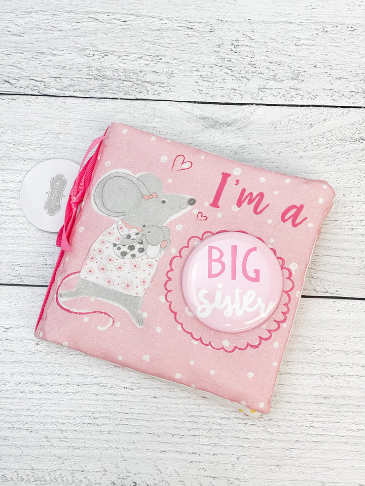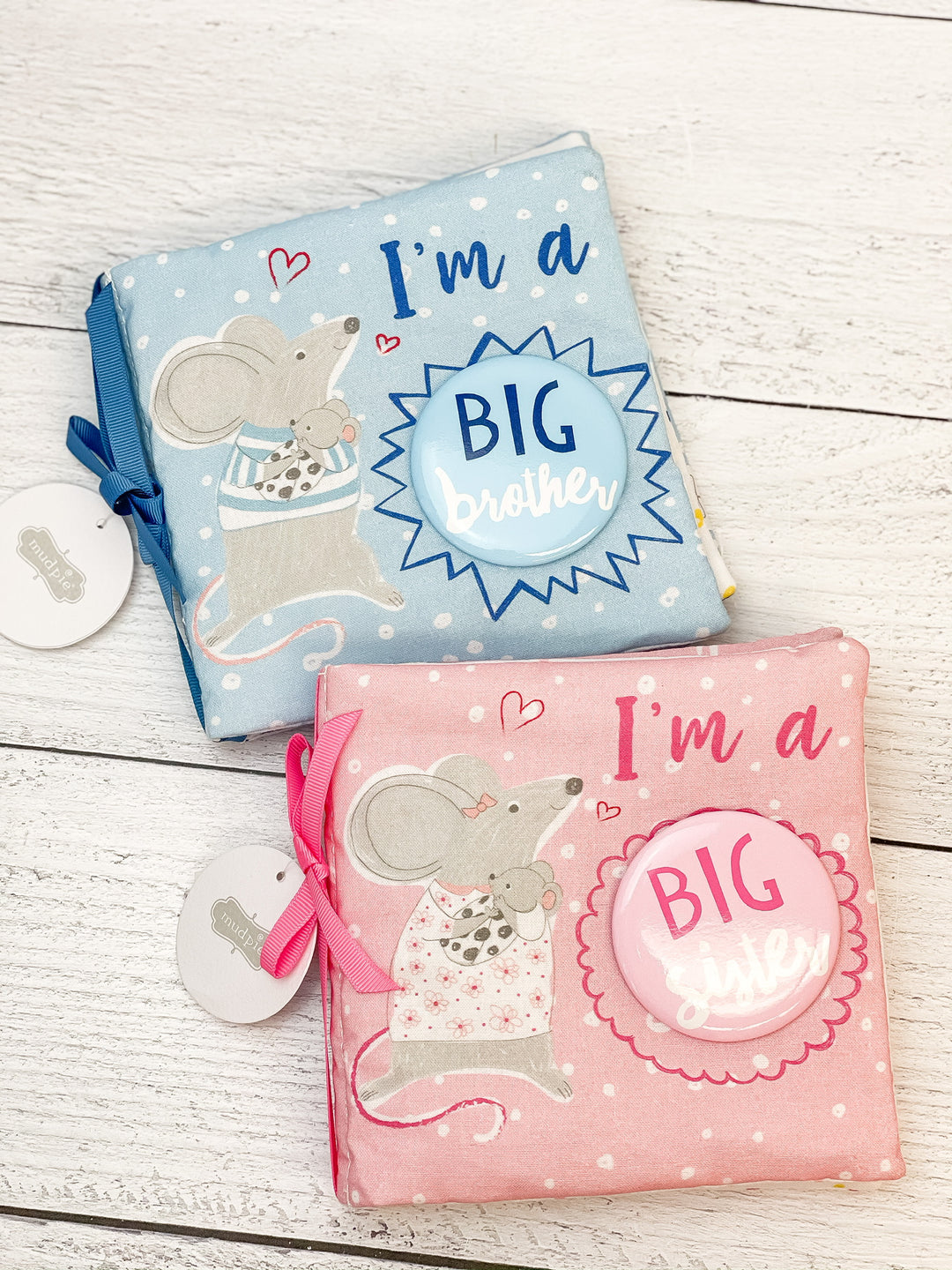 2-piece set. Soft printed cotton baby safe book with sensory crinkle paper features a sweet illustrated story about becoming a big brother, vinyl sleeve to hold photos and removable metal pin to be worn by big brother when baby arrives! Ages 3+.