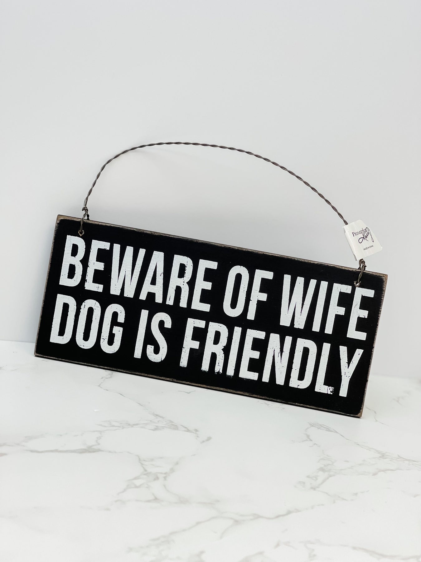 This wooden ornament features classic black and white box sign style and "Beware Of Wife Dog Is Friendly" sentiment. Our Beware Of Wife, Dog Is Friendly ornament easily hangs by twisted wire loop.