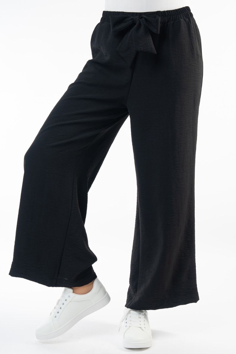 A high-waisted solid knit pant with an elastic waist featuring an adjustable belt and side pockets. Fabric is a lightweight knit.