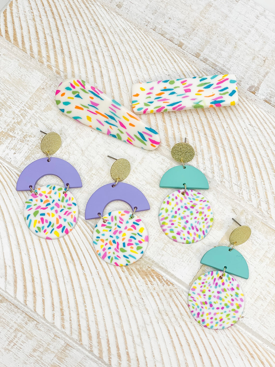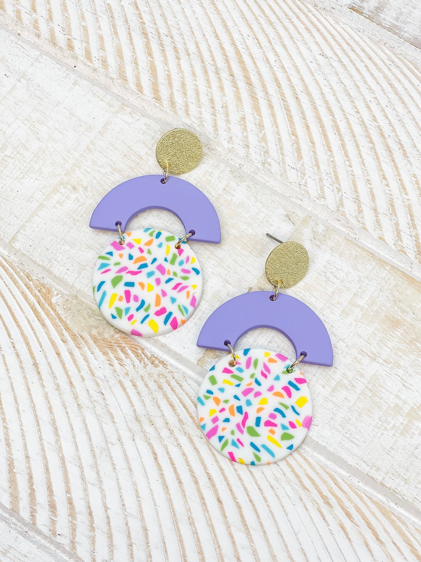 Geometric Circle Clay Dangle Earrings - Rainbow Confetti & Lavender
