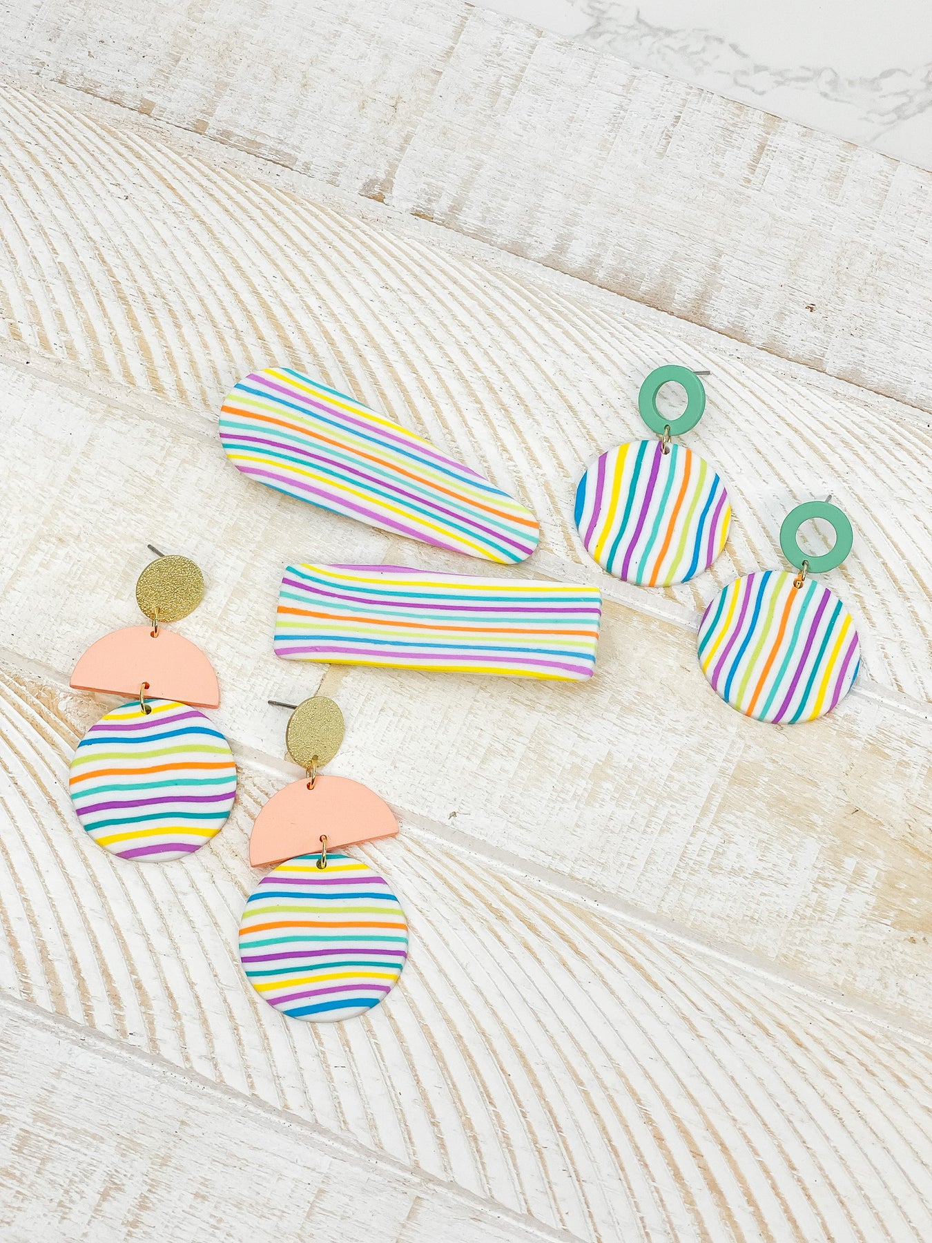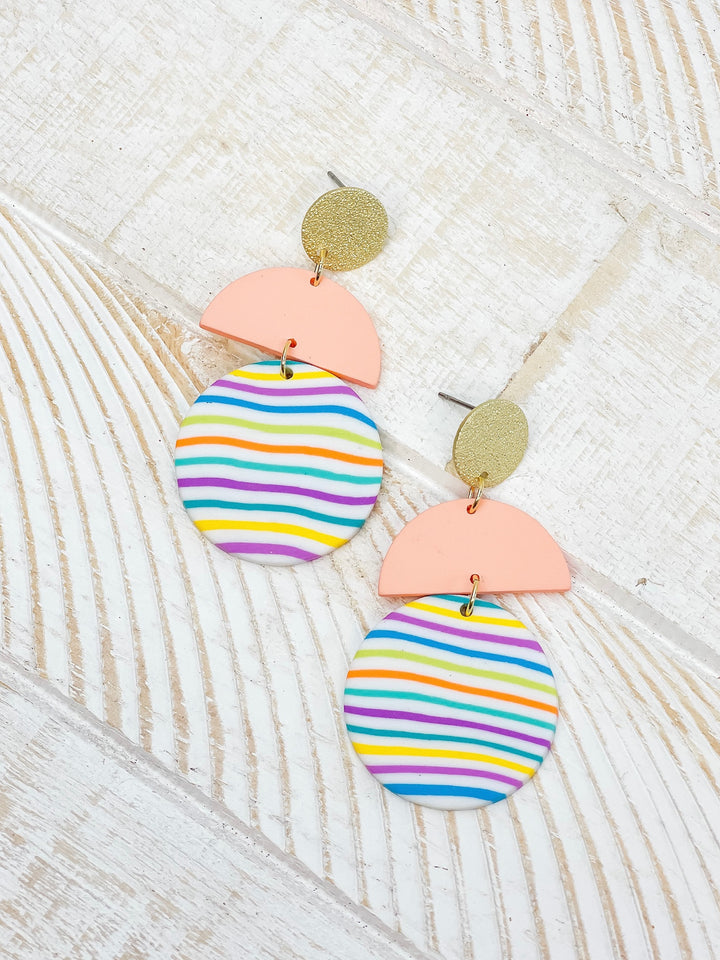 Geometric Circle Clay Dangle Earrings - Rainbow Stripe & Peach