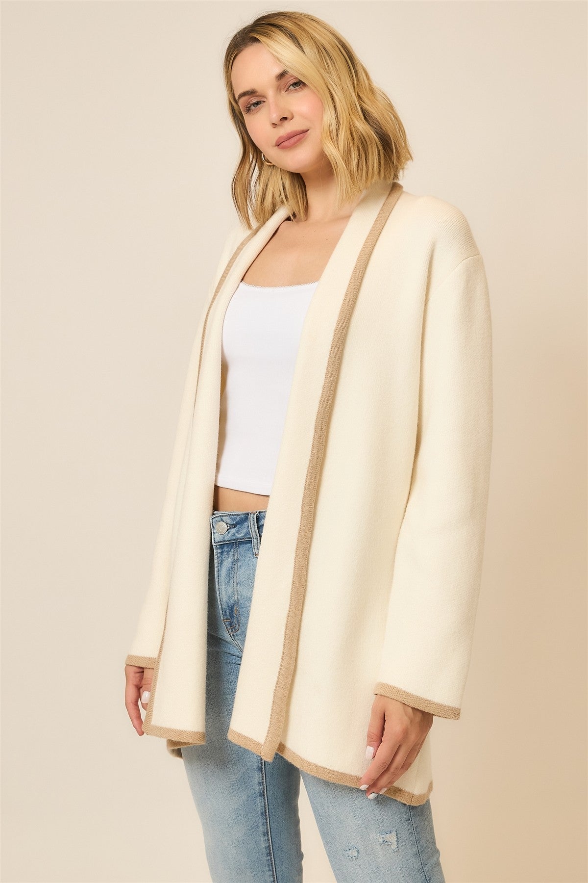 Contrast Hem Stripe Heavy Knit Cardigan - Cream/Taupe by Cozy Co