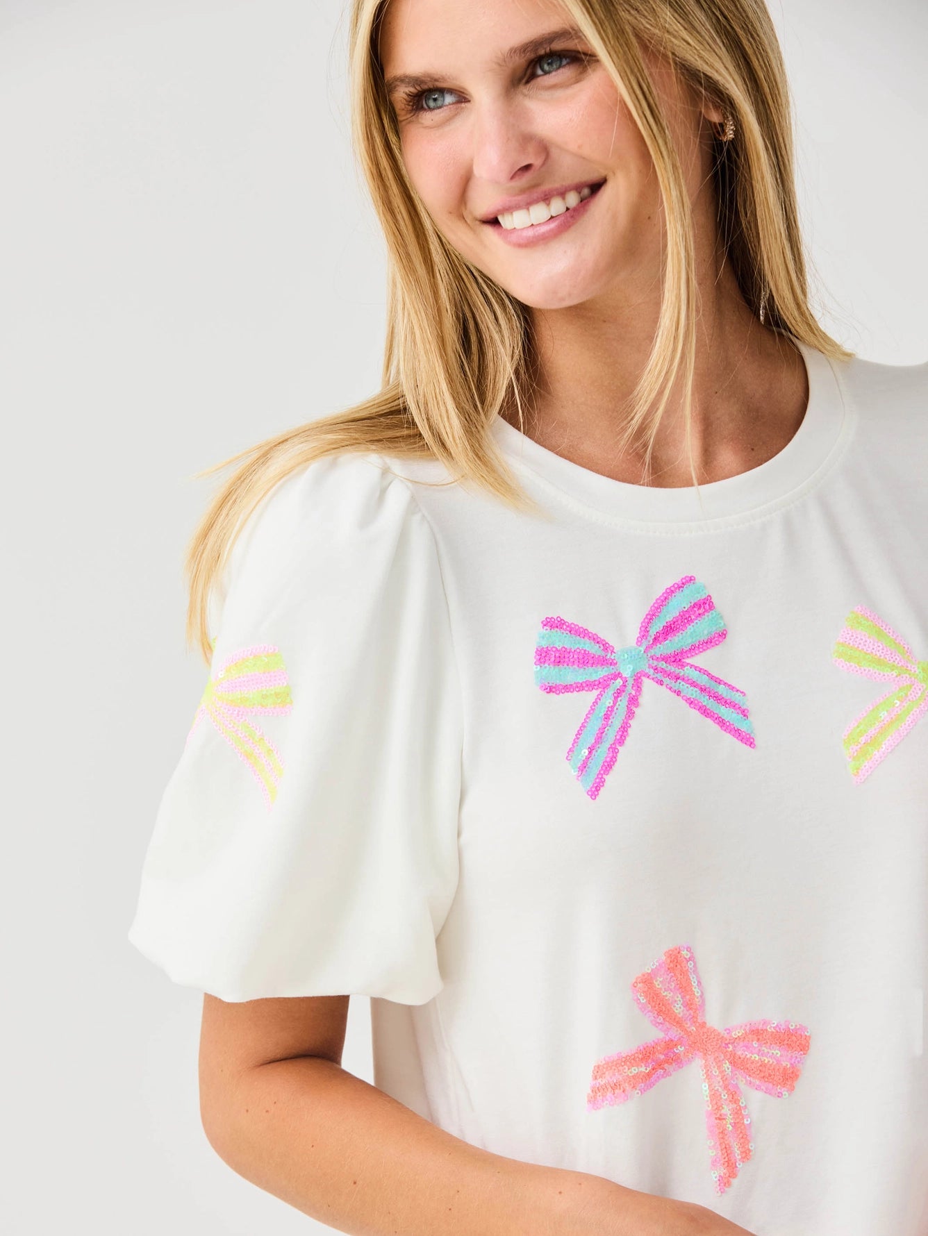 Add a pop of color and sparkle with the Tina Set. Featuring whimsical sequin bows, this set brings a playful touch to your wardrobe. The puff sleeves and relaxed fit offer both style and comfort, while the drawstring waistband with gold end caps ensures a perfect fit.