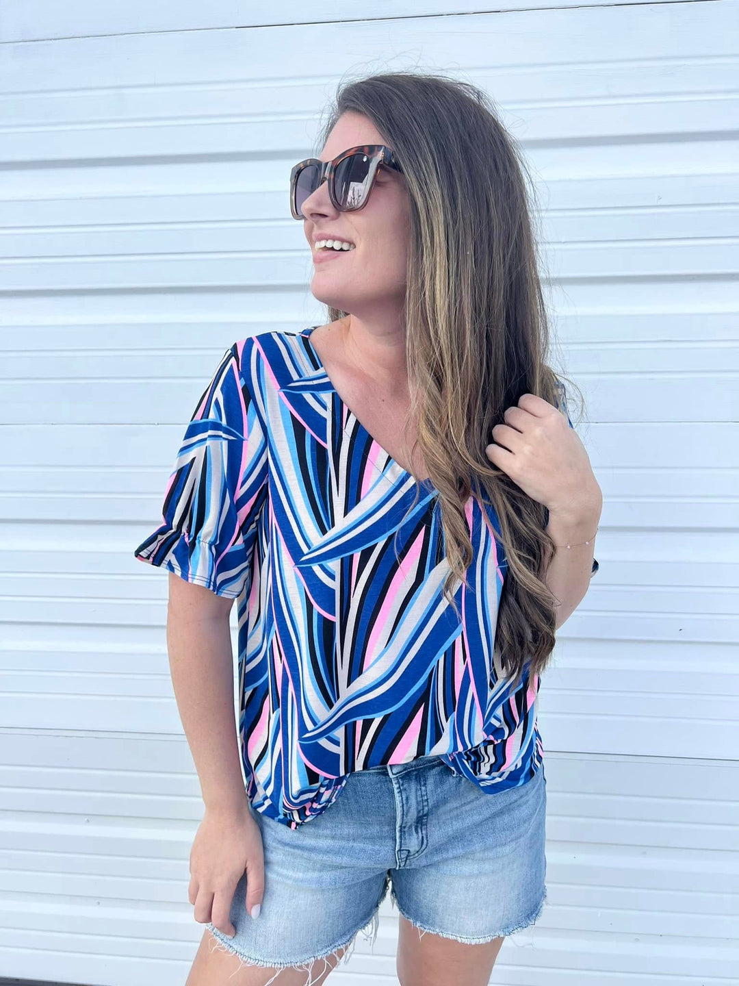 Palm V-Neck Ruffle Sleeve Top - Royal & Pink by Sew In Love