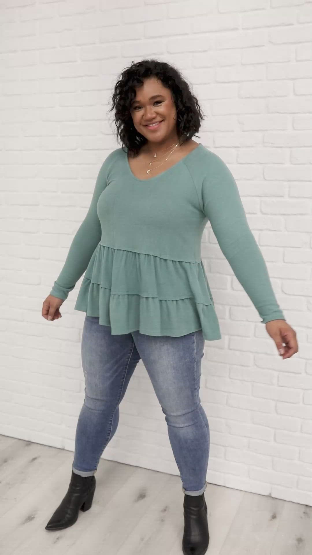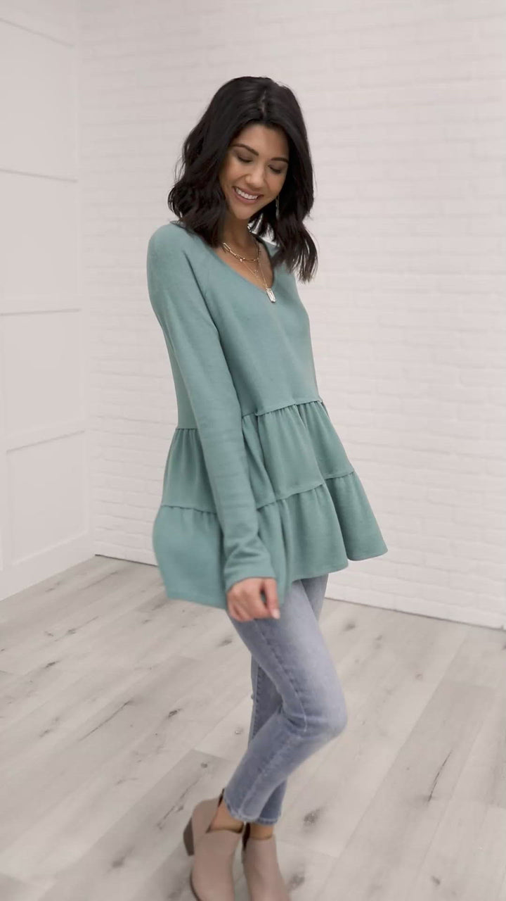 The Nicely Done Tiered Top is the perfect icy blue for cooler days! This soft top has a flowy silhouette created by the gathered tiers and long sleeves. This top is not only cute, but it's so comfortable to wear and looks darling with jeans and tall boots!