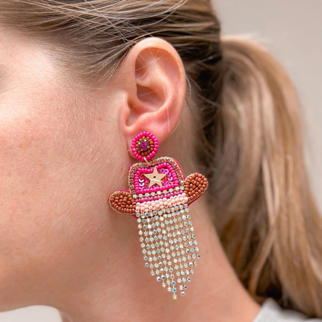 Enamel Cowboy Hat Dangle Earrings - Pink