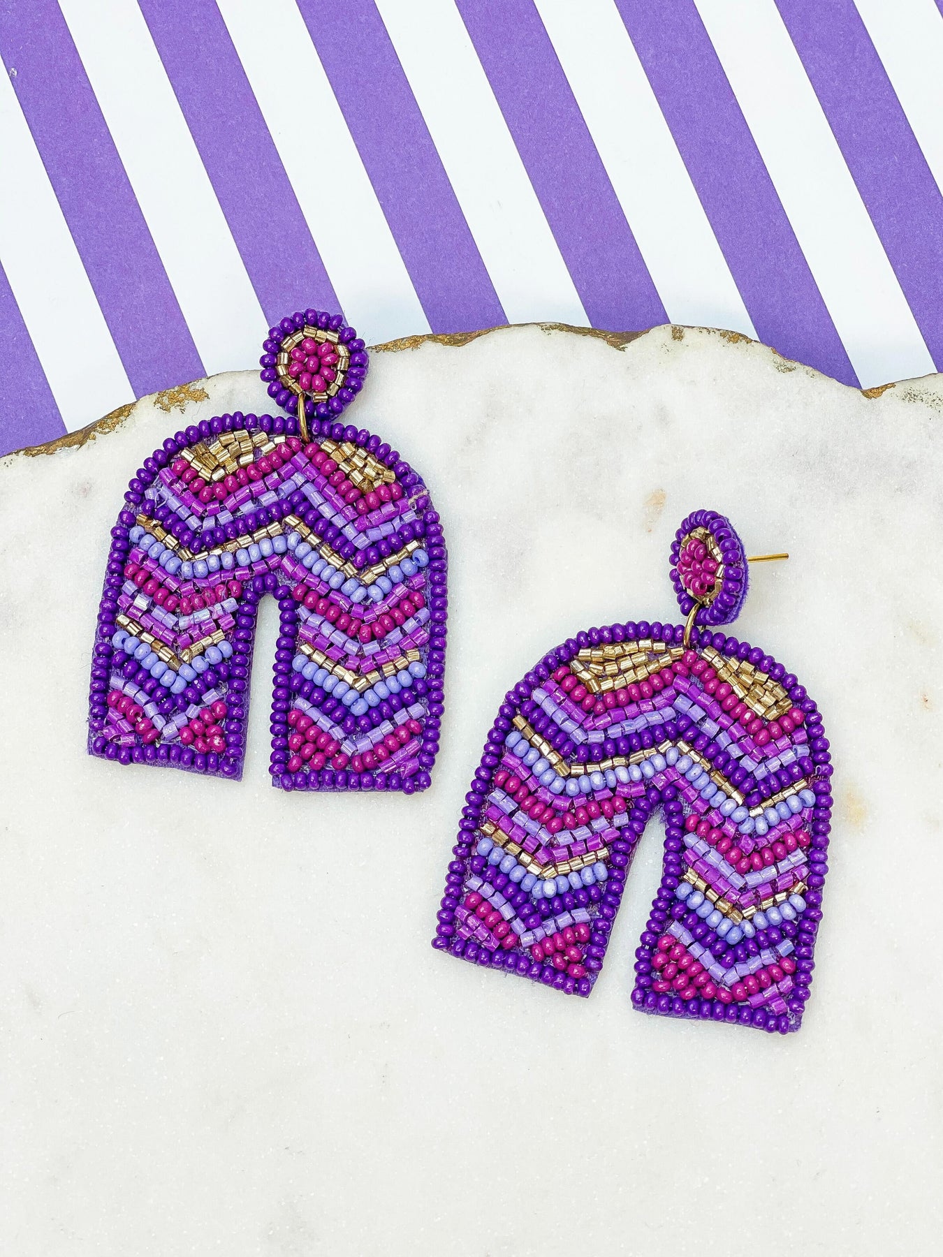 Elevate your outfit with our Purple Striped Beaded Horseshoe Dangle Earrings. These fun statement earrings add a touch of whimsy to any look. The unique design and playful colors make them a must-have accessory. Upgrade your style with these eye-catching earrings.