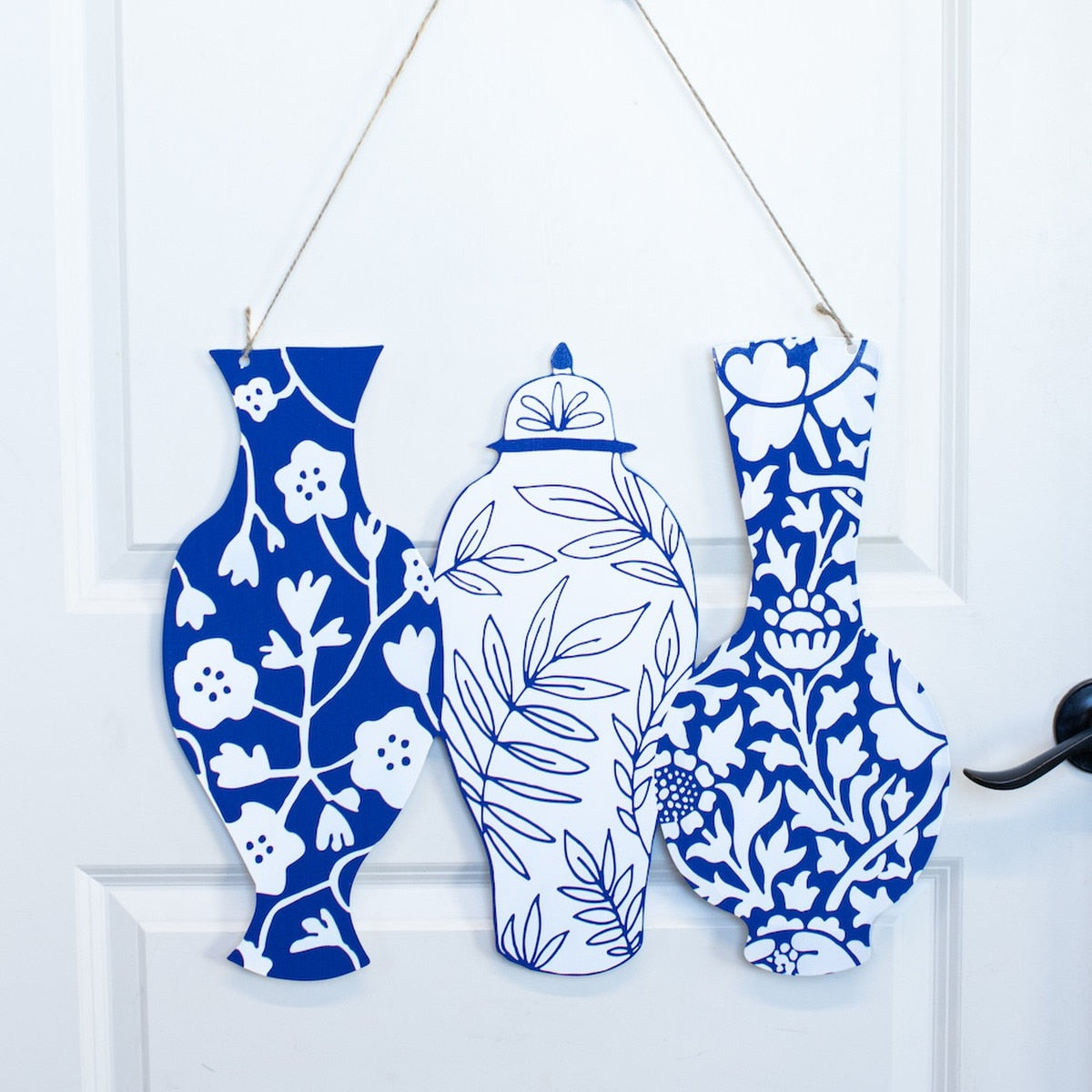 Add a touch of elegance to your home decor with this beautiful Chinoiserie Vases Door Hanger featuring a blue and white design. Measuring 19.25x19.75, it is the perfect size to hang on any door or wall.