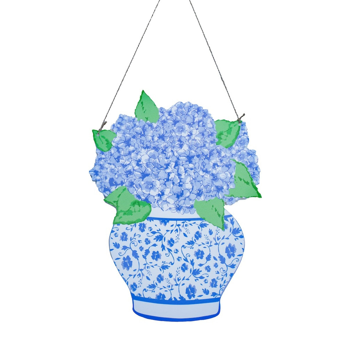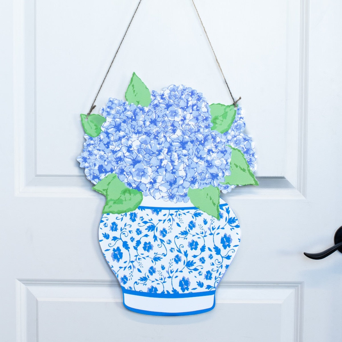 Add a touch of elegance to your front door with our Hydrangea Vase Door Hanger in Blue/White, measuring 19.75x15.75. Featuring beautiful hydrangea blooms in a vase, this door hanger is perfect for adding a pop of color and charm to your home.