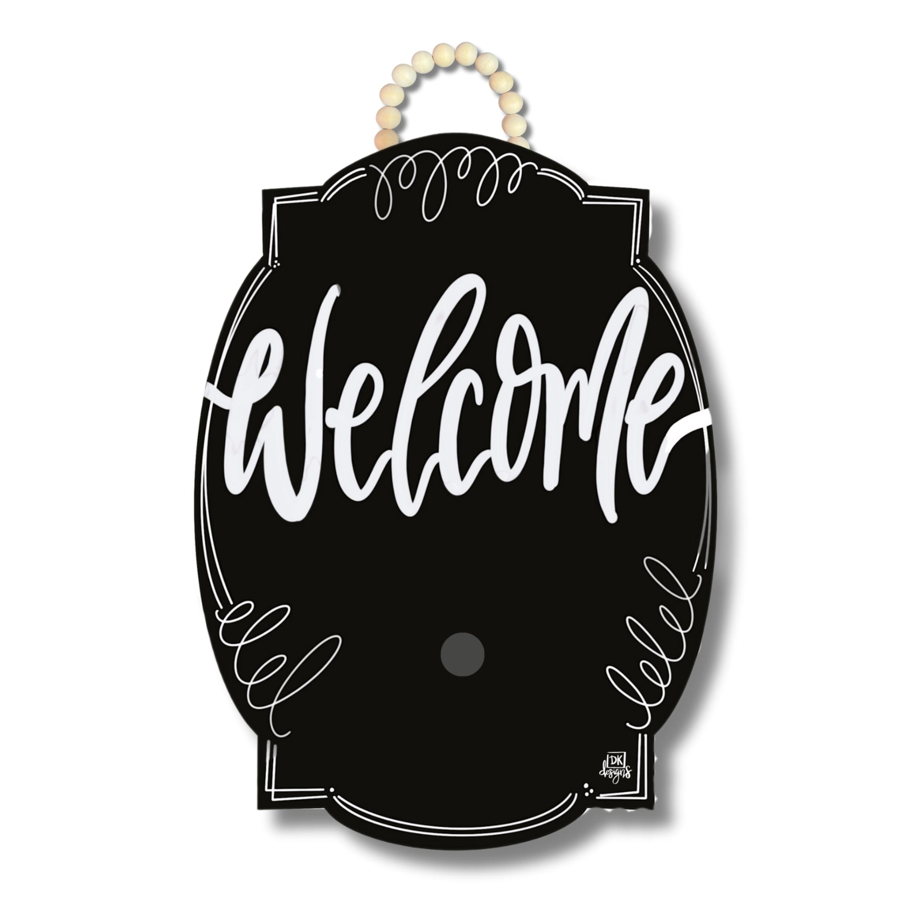 The Black Bloom "Welcome" Hanger + Mini is the perfect “jewelry” for your door! Show off your style with a beautifully designed door hanger featuring a "Welcome" message on a black background. Included is a removable DK Mini that Velcro’s on and off for easy seasonal or style changes.