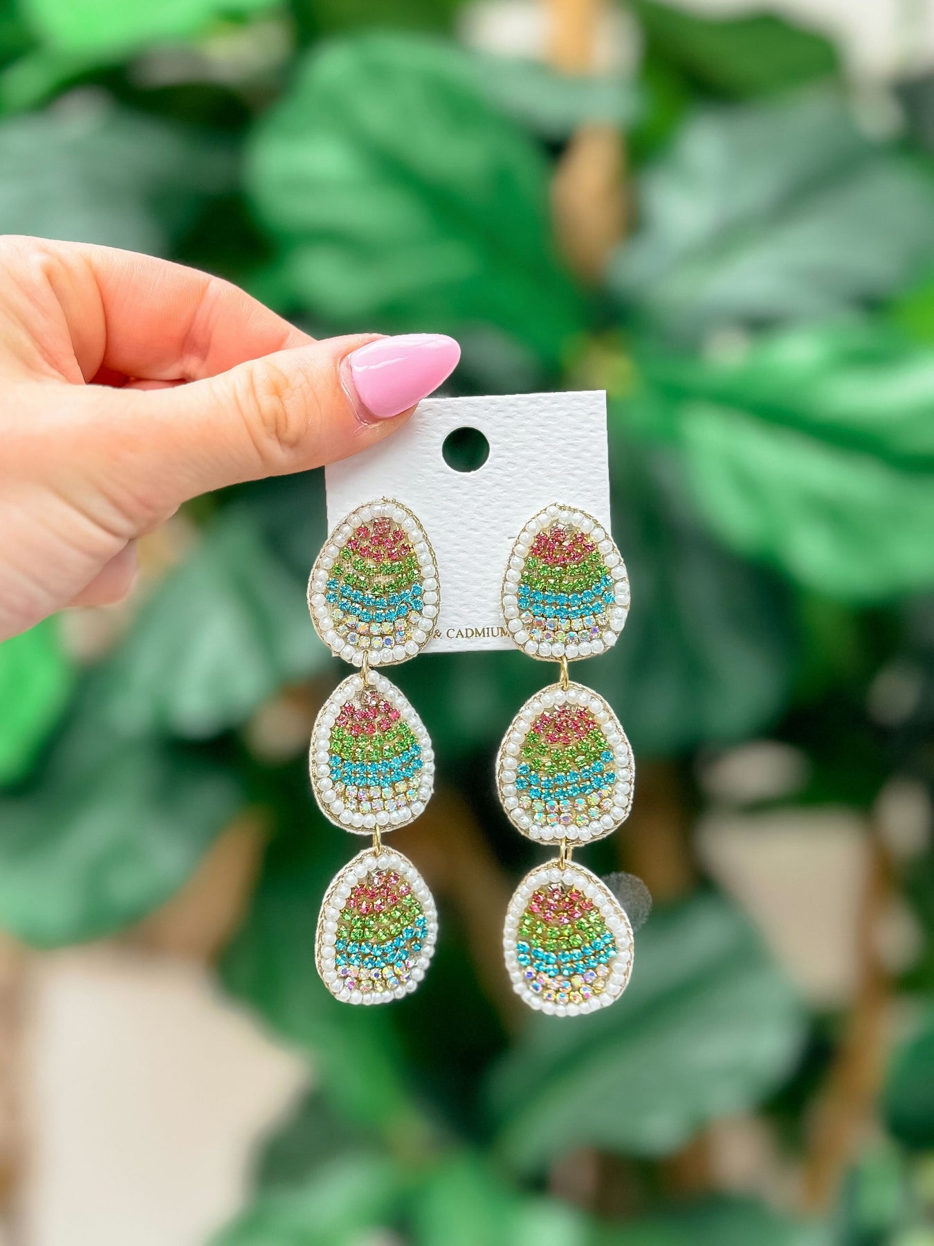 Add some sparkle to your Easter outfit with these rhinestone dangle earrings. The perfect combination of glitz and holiday spirit, these earrings are sure to catch everyone's attention. Elevate your style with a touch of Easter glam.