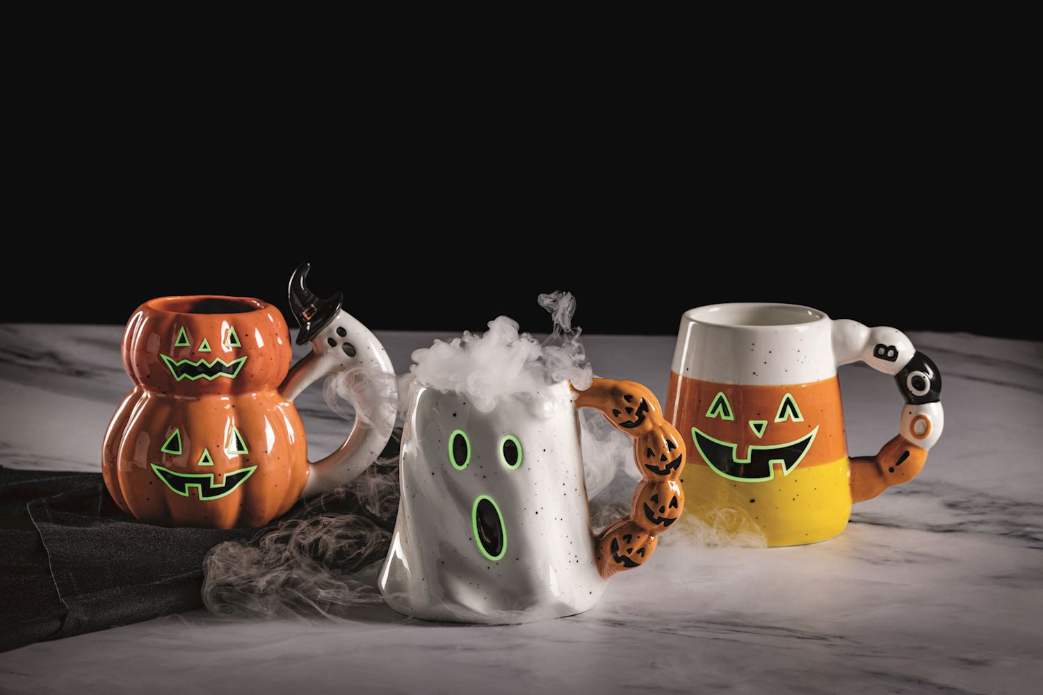 Ceramic mug features glow-in-the-dark facial features and hand-painted handle.
