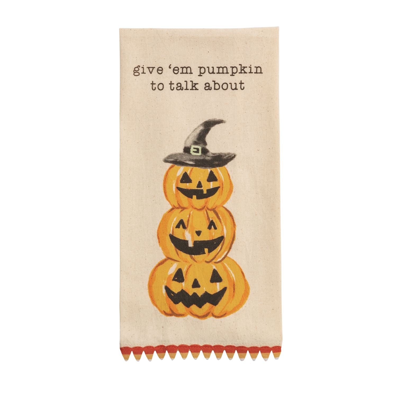 Flour sack hand towel features candy corn icon or mini pom trim.