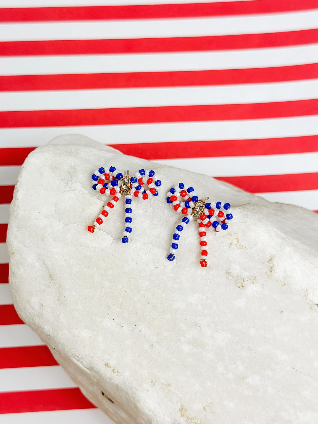 These Red, White, & Blue Beaded Bow Stud Earrings add a touch of patriotism to any outfit. The intricate bow design and colorful beads make a statement while still being subtle and stylish.