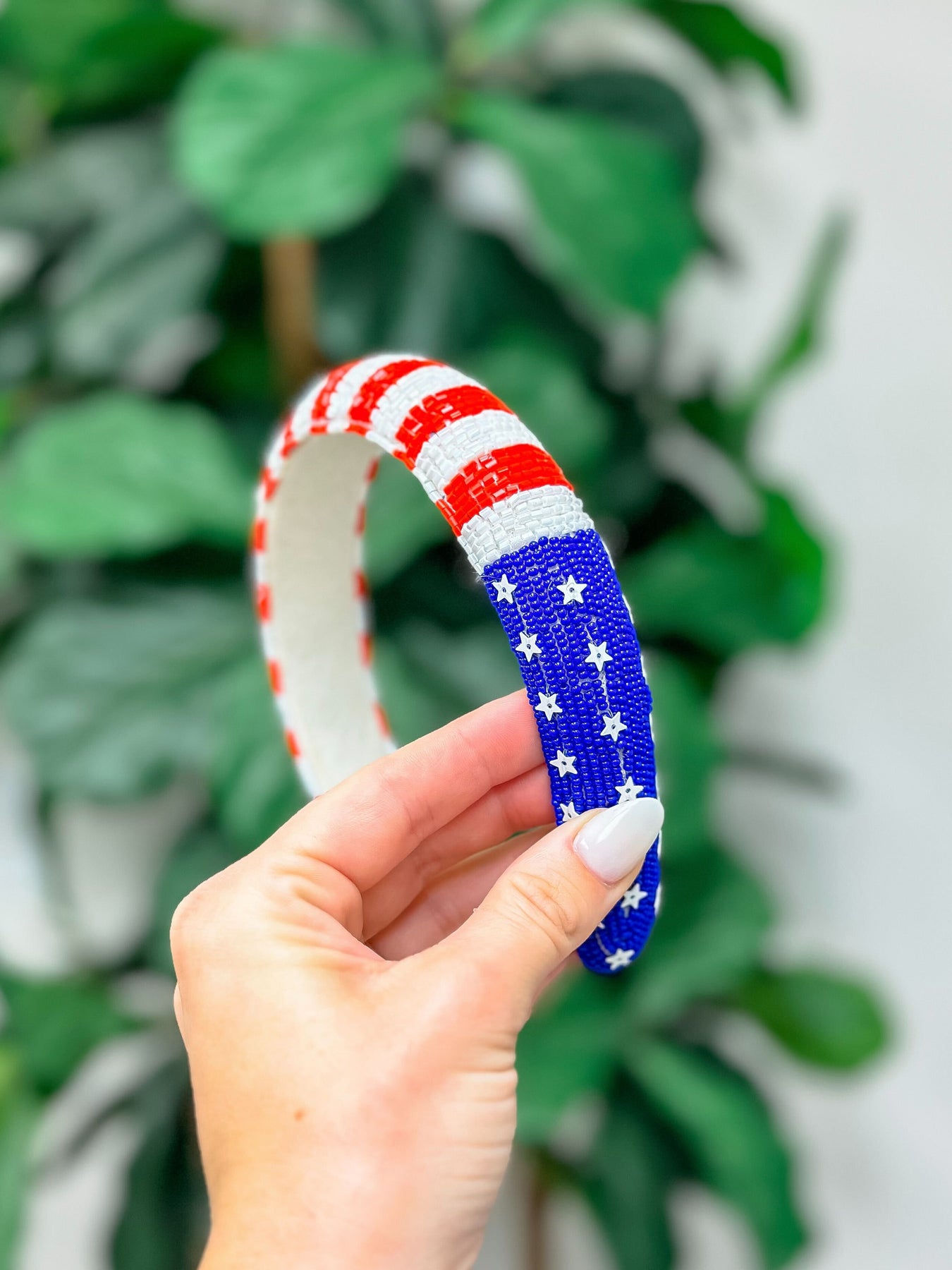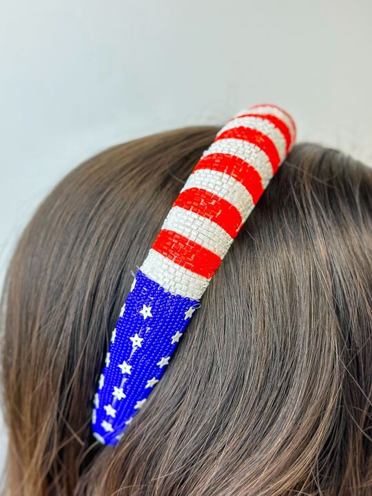 Add a touch of Americana charm to your look with our Stars & Stripes All Over Seed Bead Headband. Perfect for festivals, parties, or everyday wear!