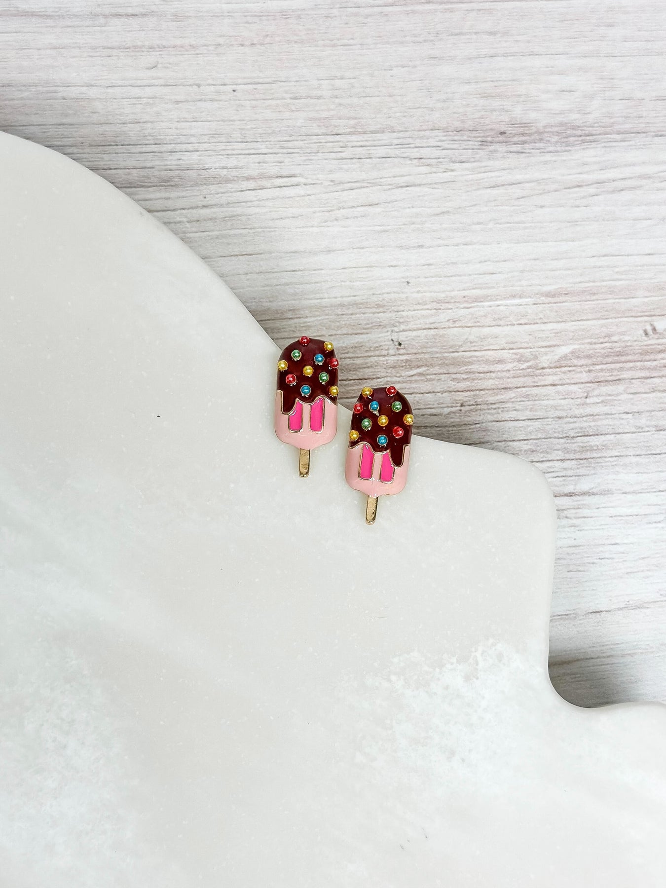 Add a playful touch to your outfit with these Ice Pop Embellished Stud Earrings. These sweet treats add a fun and colorful element to your ensemble, making them perfect for any occasion.