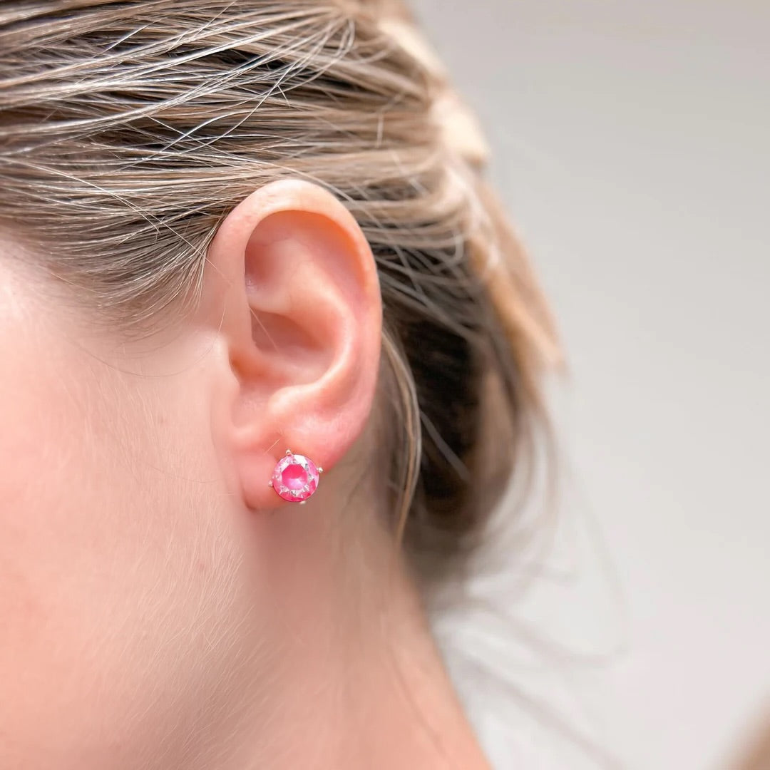 Round Iridescent Glass Crystal Stud Earrings - Pink