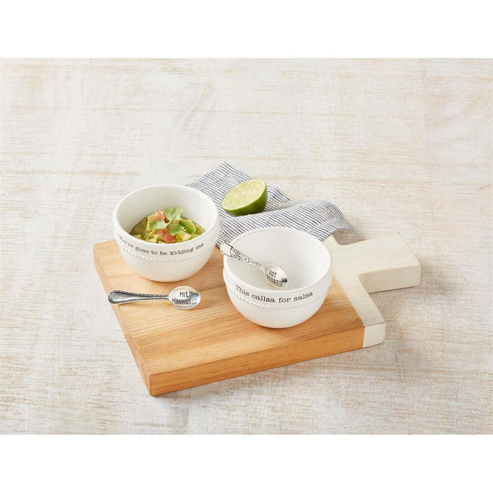 4-piece set. Two debossed ceramic dip bowls arrive with two silverplate spoons