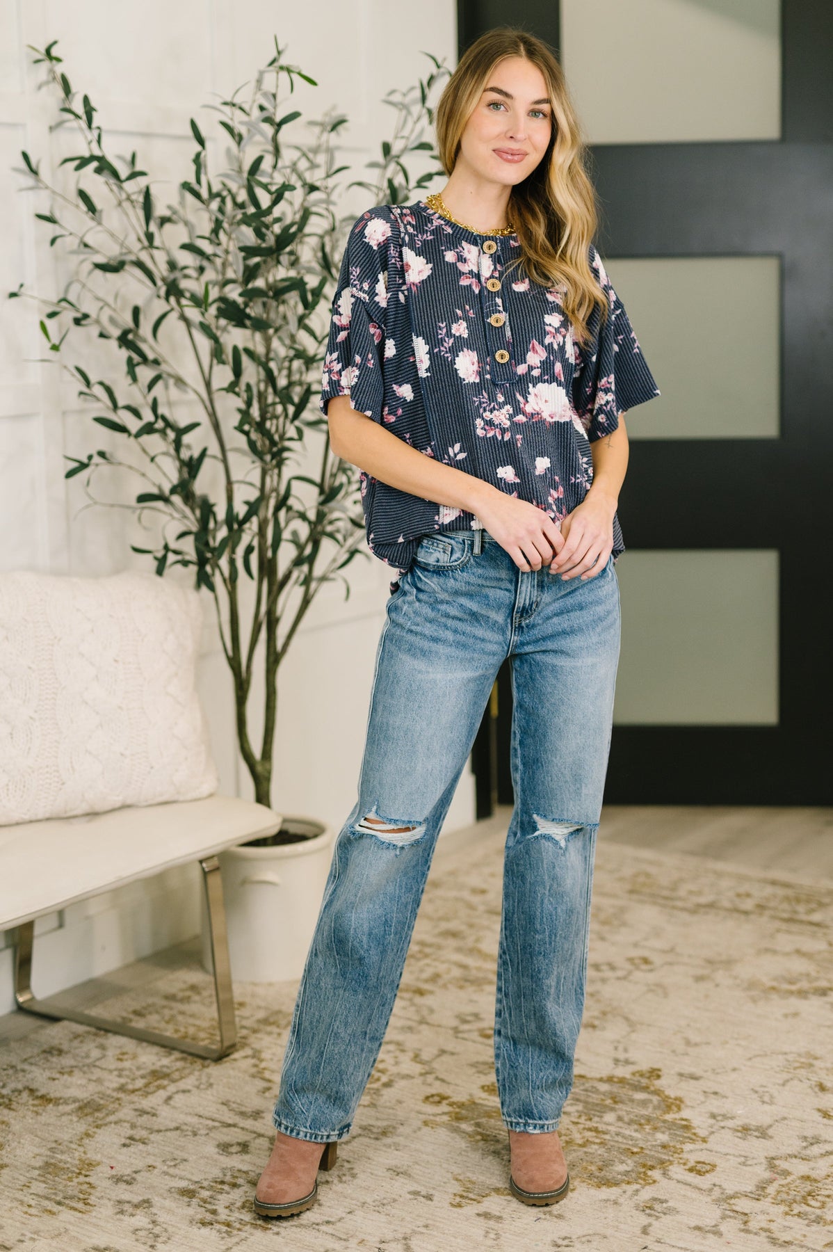 Really Simple Floral Henley Top Comfort meets character in this cable-ribbed henley that stretches with your every move. Half-button closures let you adjust the neckline your way, while exaggerated sleeve cuffs make a subtle statement. High-stretch fabric keeps things flexible, and exposed seam details add an artful edge. Simple never looked so good.