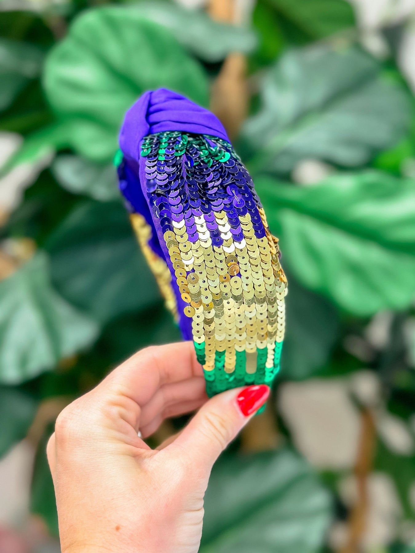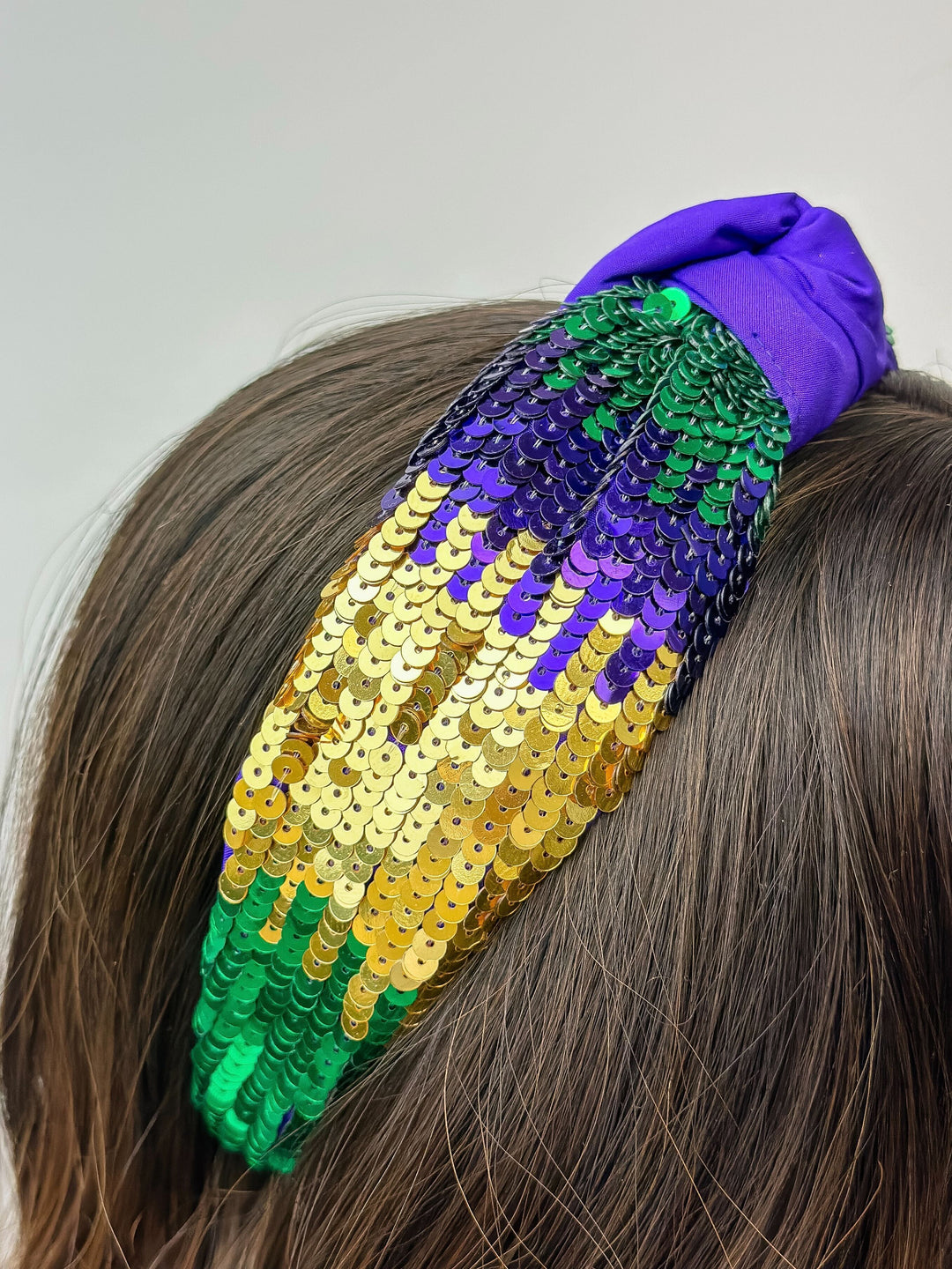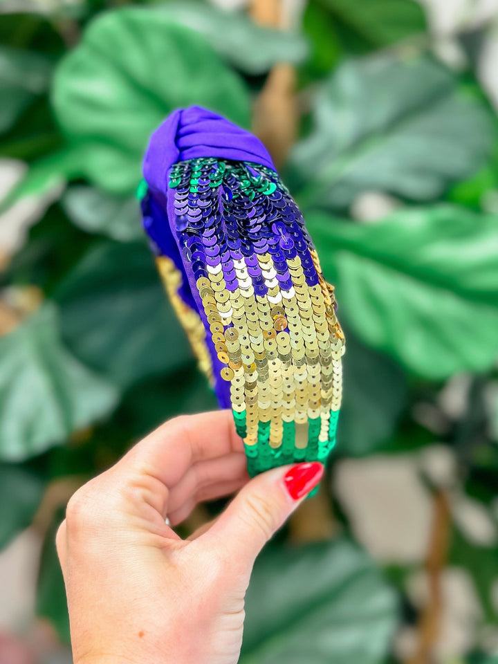 Add a touch of sparkle to your Mardi Gras look with our Sequin Embellished Headband. The sequins will catch the light as you celebrate, making you stand out in the crowd. Elevate your festivities with this beautiful headband.
