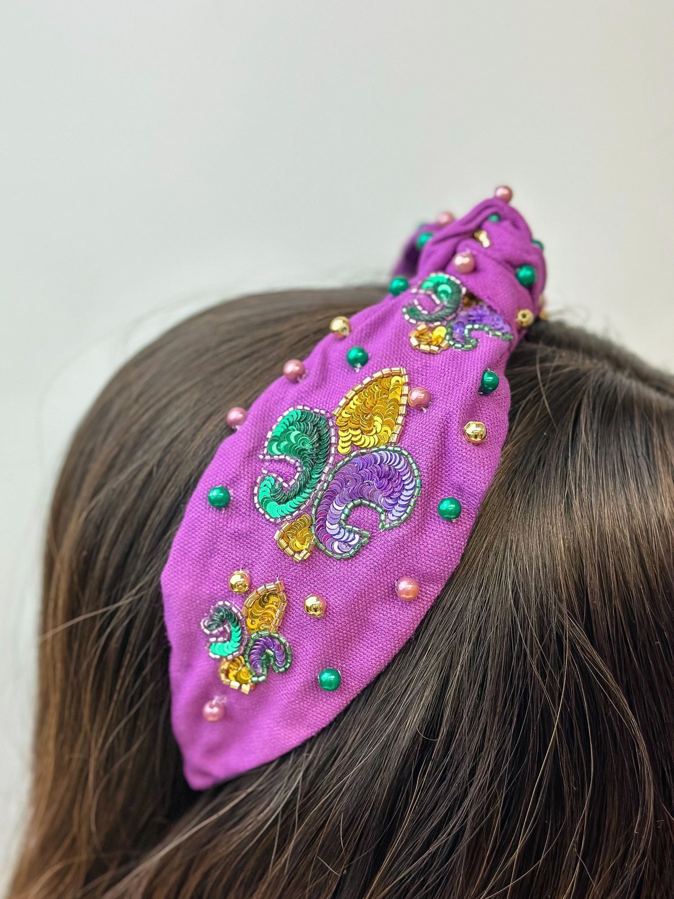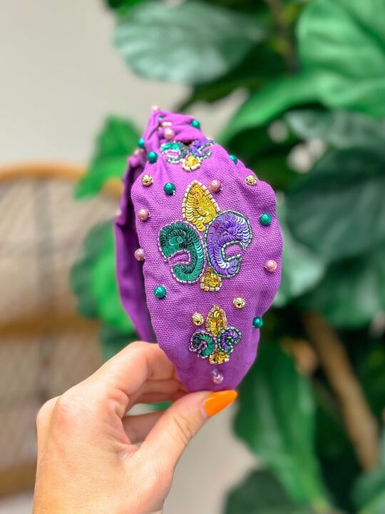 This elegant headband features sequin Fleur-de-lis embellishments for a timelessly stylish look.