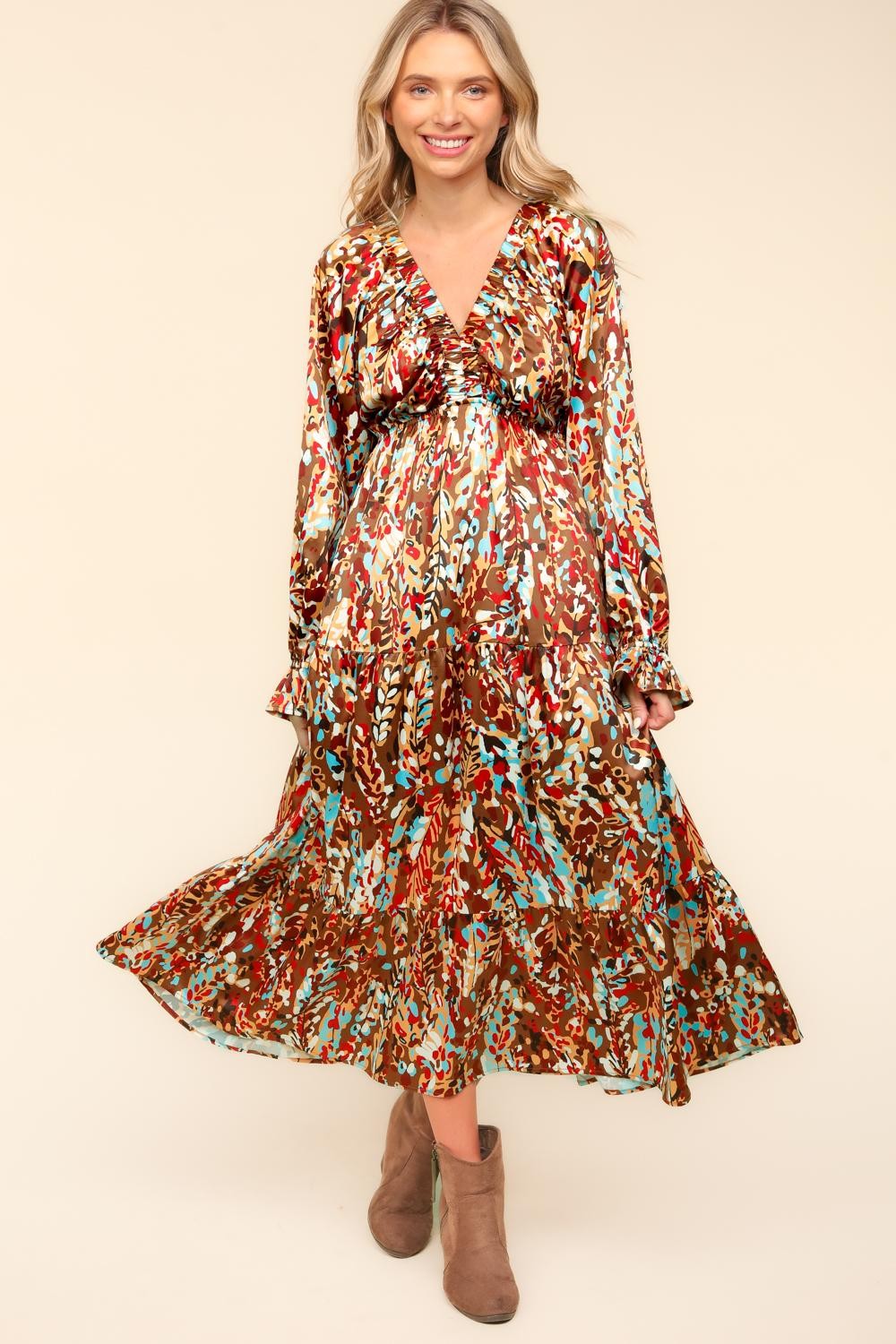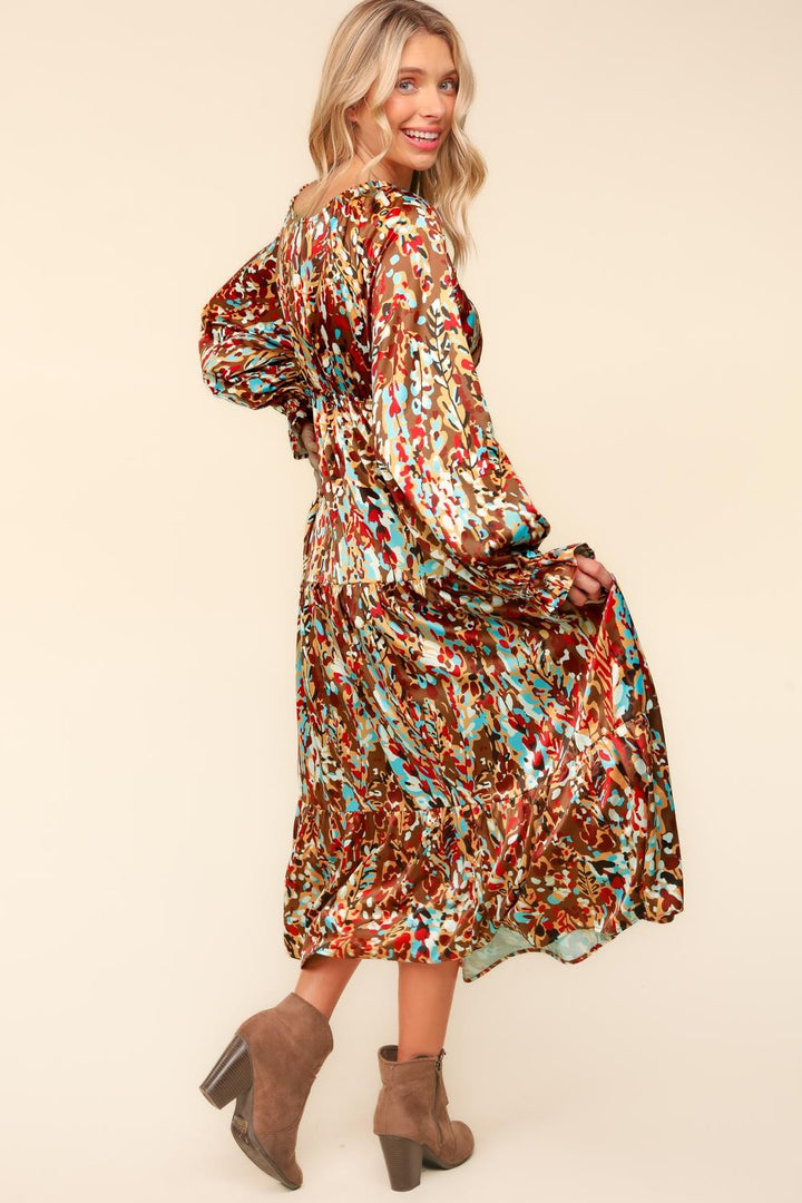 Satin Floral Long Sleeve Babydoll Maxi Dress - Mocha