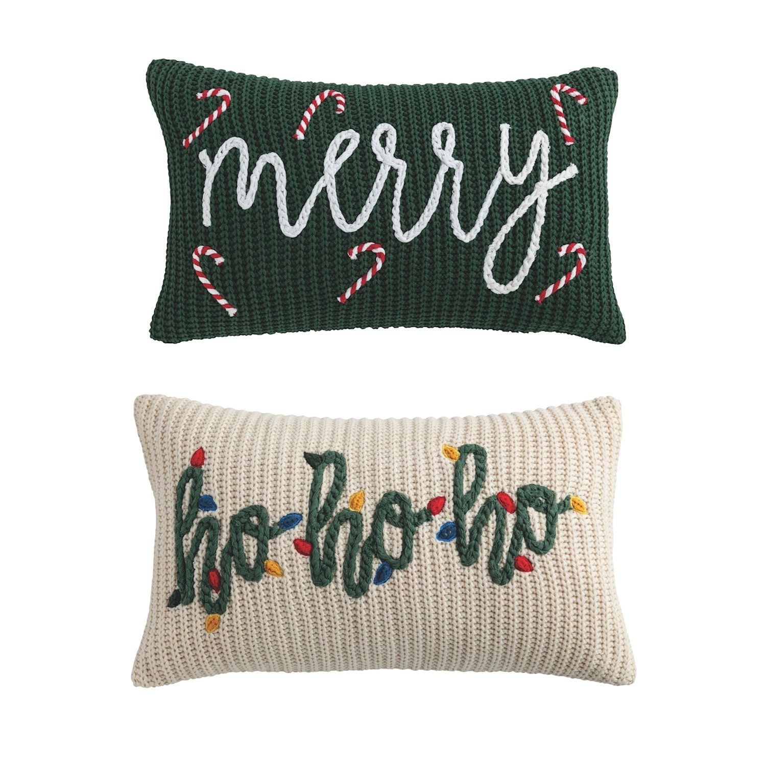 Chunky knit pillow features sentiment embroidery and contrast woven stripe backing. Zipper closure.