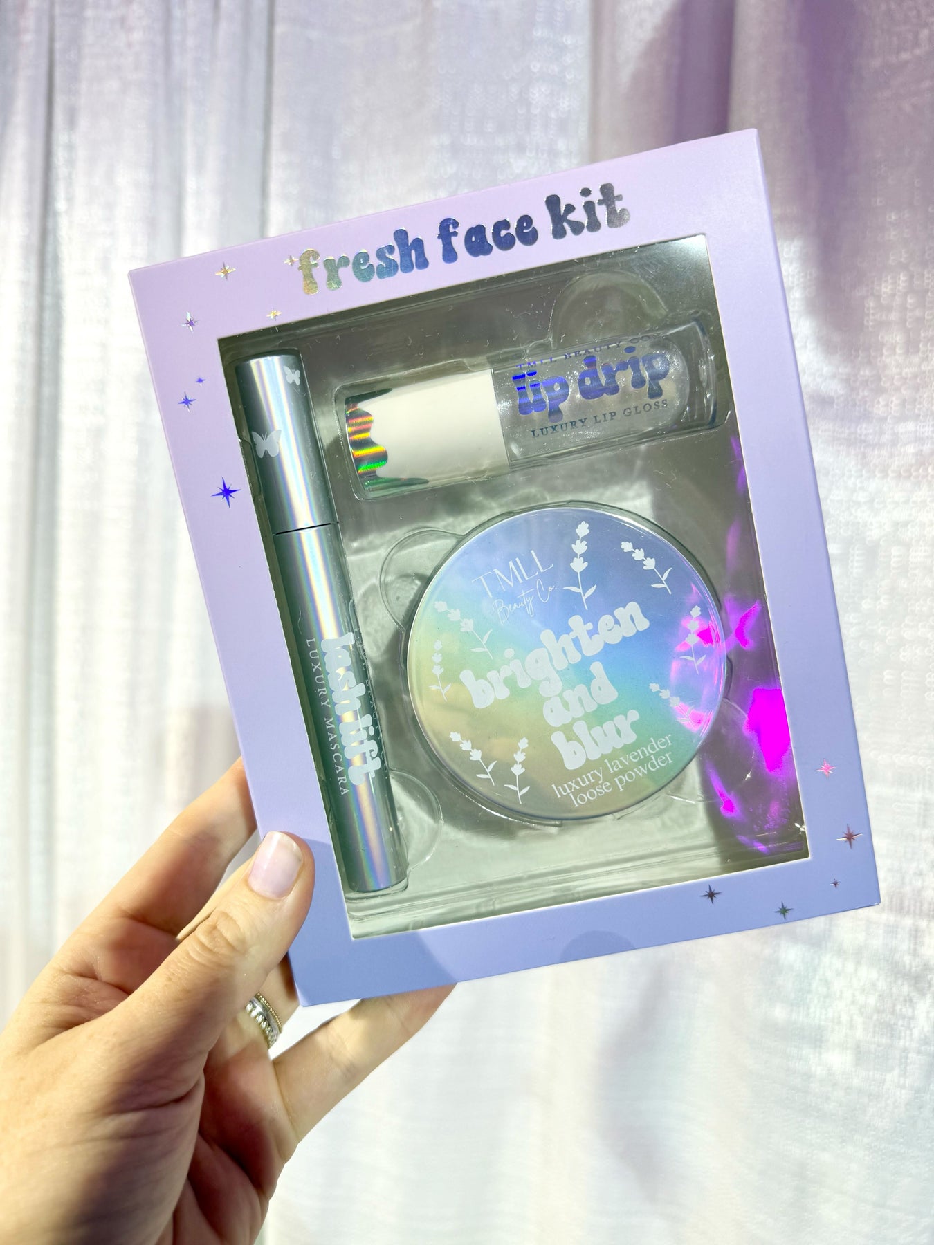 Set of Luxury Mascara, Glazed Donut Lip Drip, and Lavender Loose Powder.