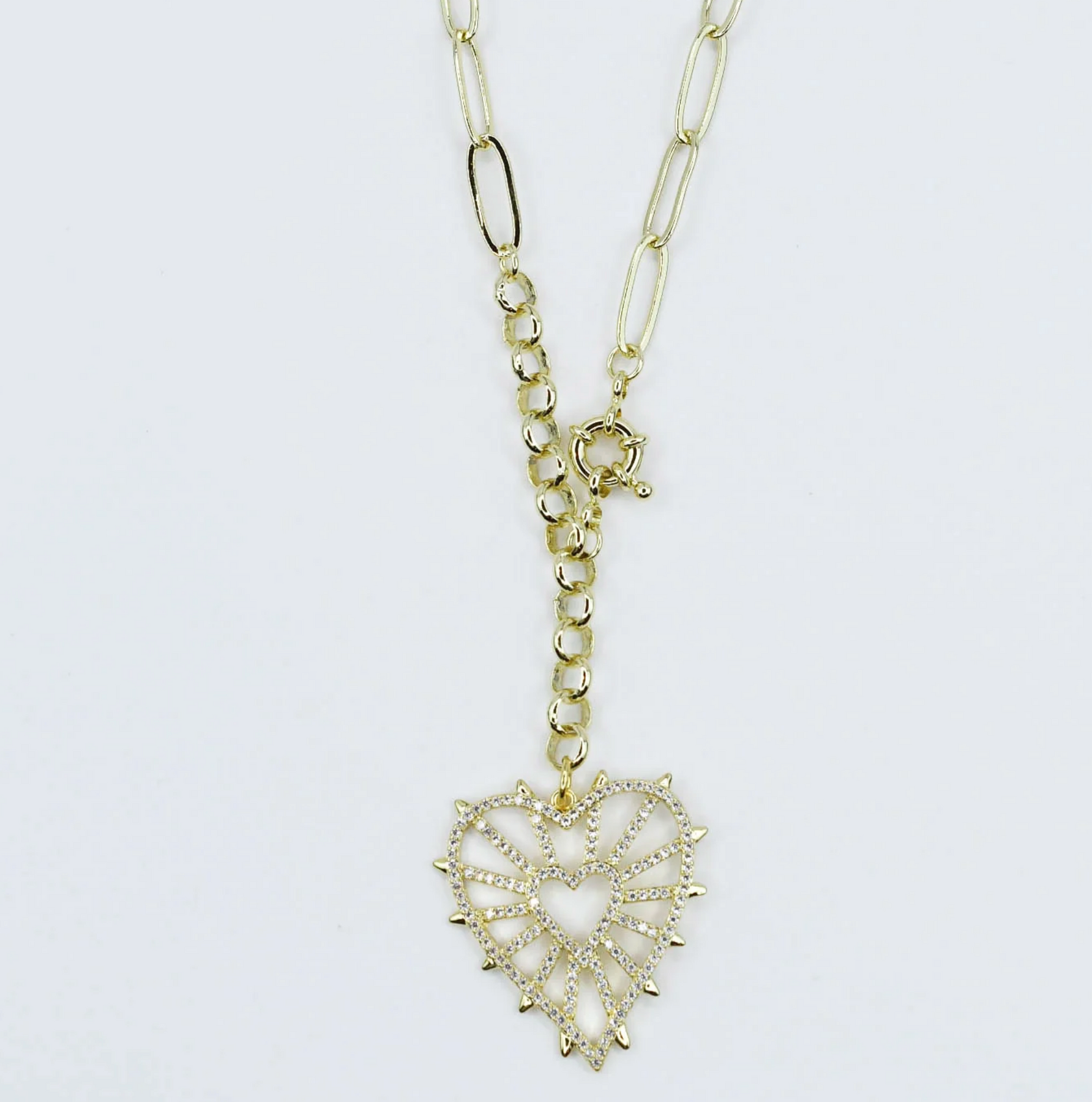 Romantic and eye-catching statement of love and style. Featuring a gold paperclip chain and stunning overwork heart pendant with lace-like detailing.