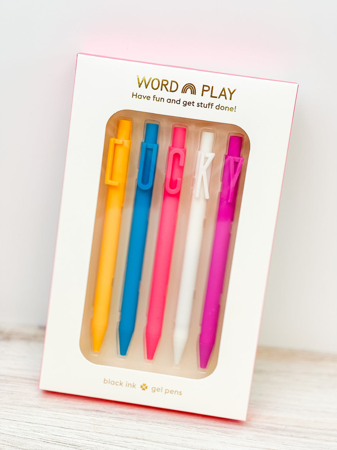 Our beautifully packaged WORD PLAY pens have letter clips, soft touch barrels and black gel ink.