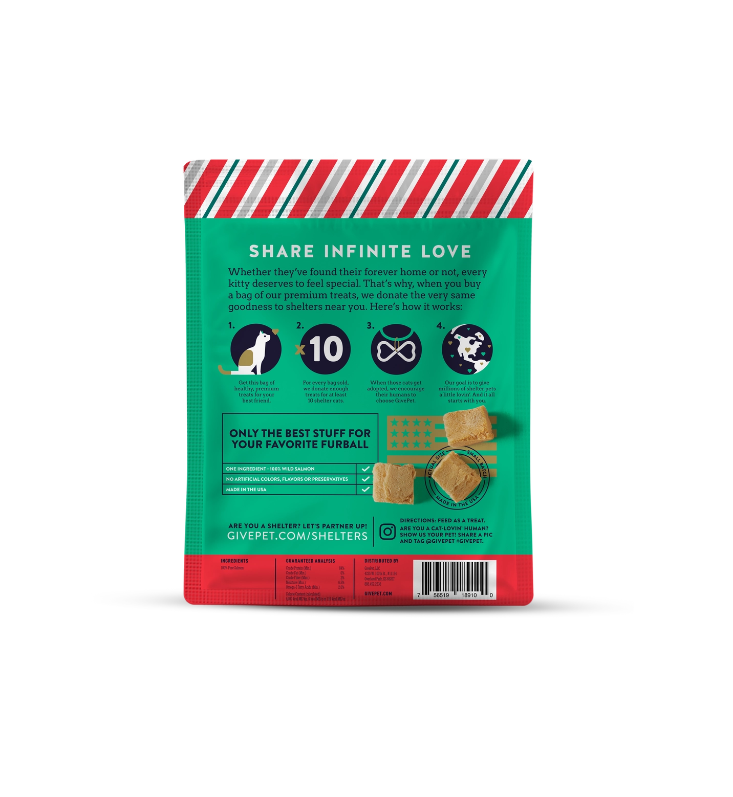 Made in the USA with no artificial ingredients, flavors or preservatives. Plus, for every bag of treats sold, GivePet donates their premium treats to shelters to share.