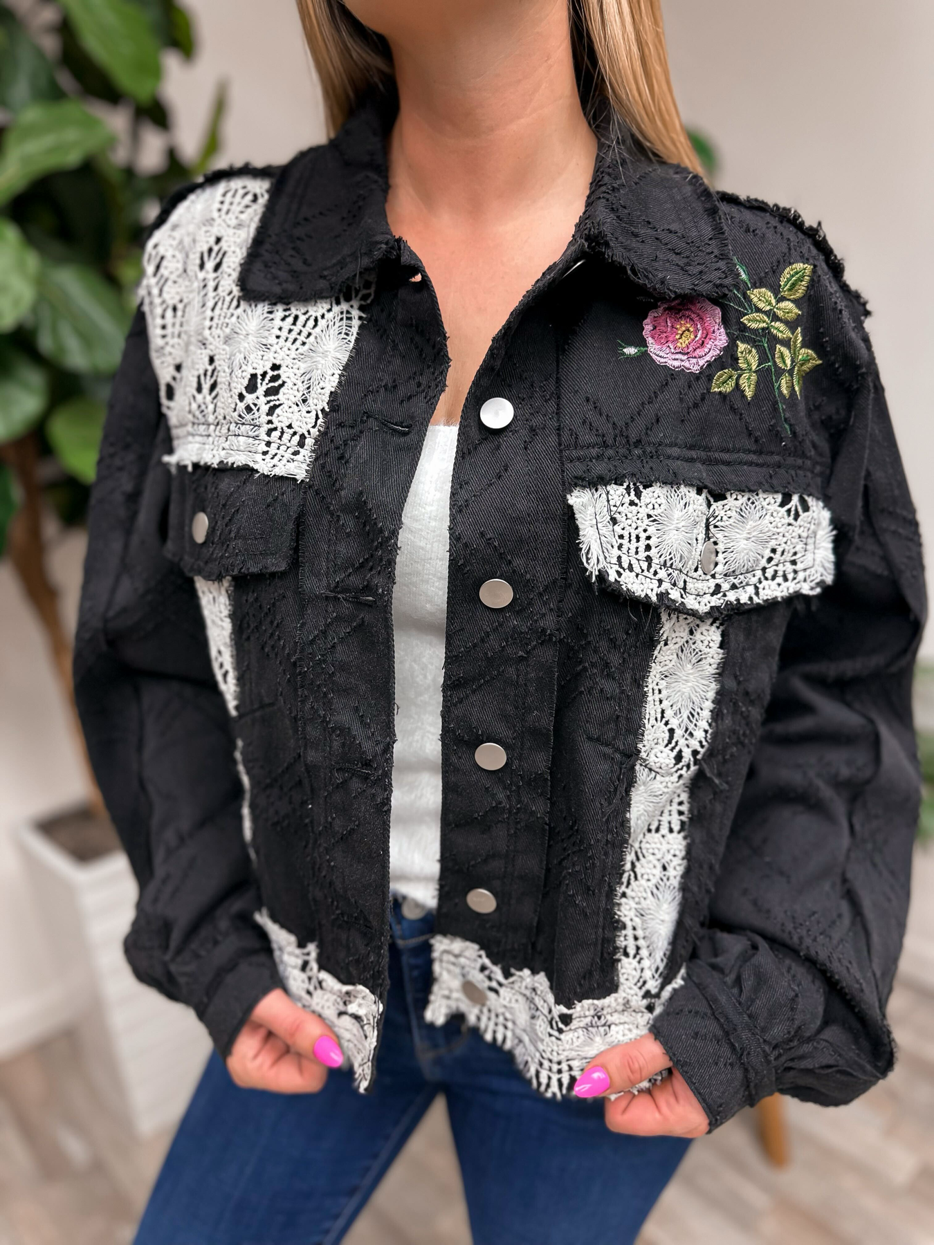 'PEACE' Embroidered Textured Lace Jean Jacket by POL - Black Multi