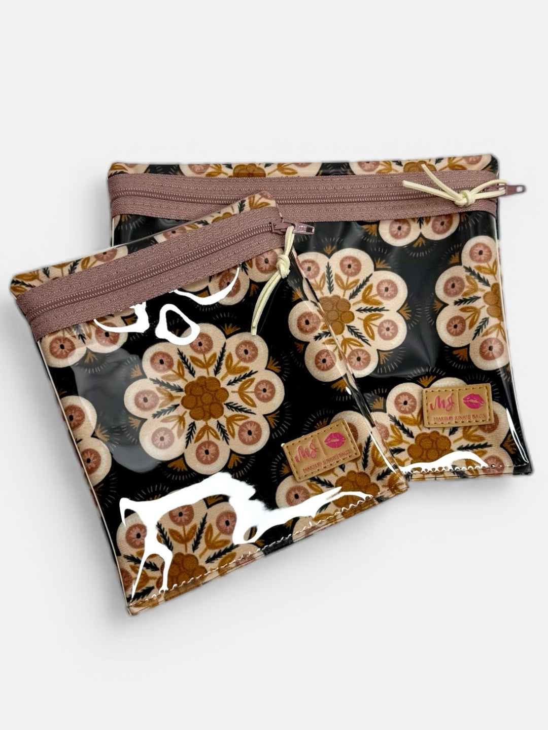 These cult-favorite cosmetic bags are loved for their signature lay-flat design, wipeable interiors, and handcrafted Texas quality. They unzip completely so you can see everything inside — no more digging through your makeup bag.