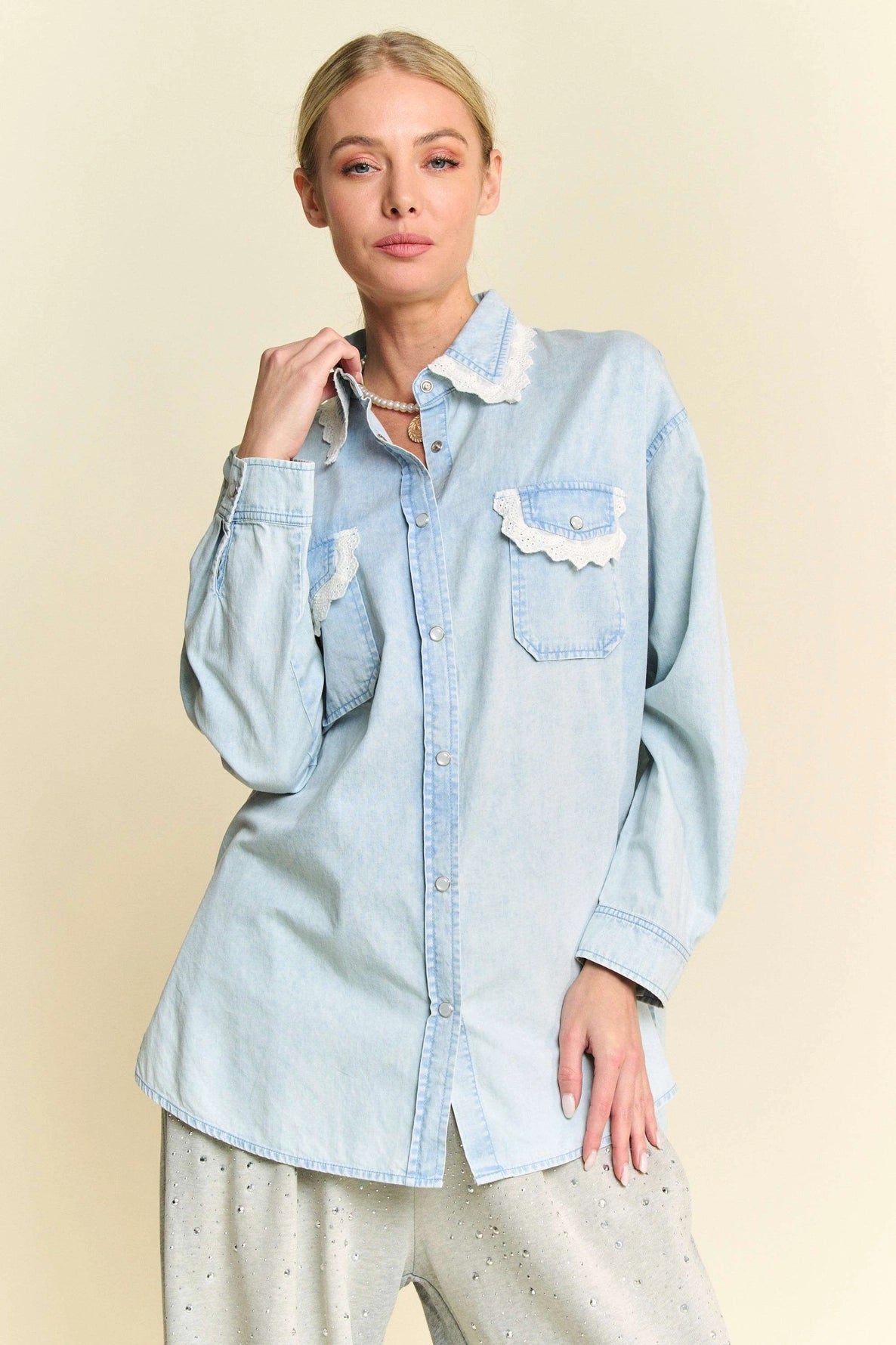 This lace-trim denim button-down shirt blends casual ease with feminine charm. Featuring delicate lace accents on the collar and chest pockets, it elevates classic denim with soft detailing. Designed with a relaxed fit and versatile wash, it pairs effortlessly with trousers, skirts, or casual joggers.