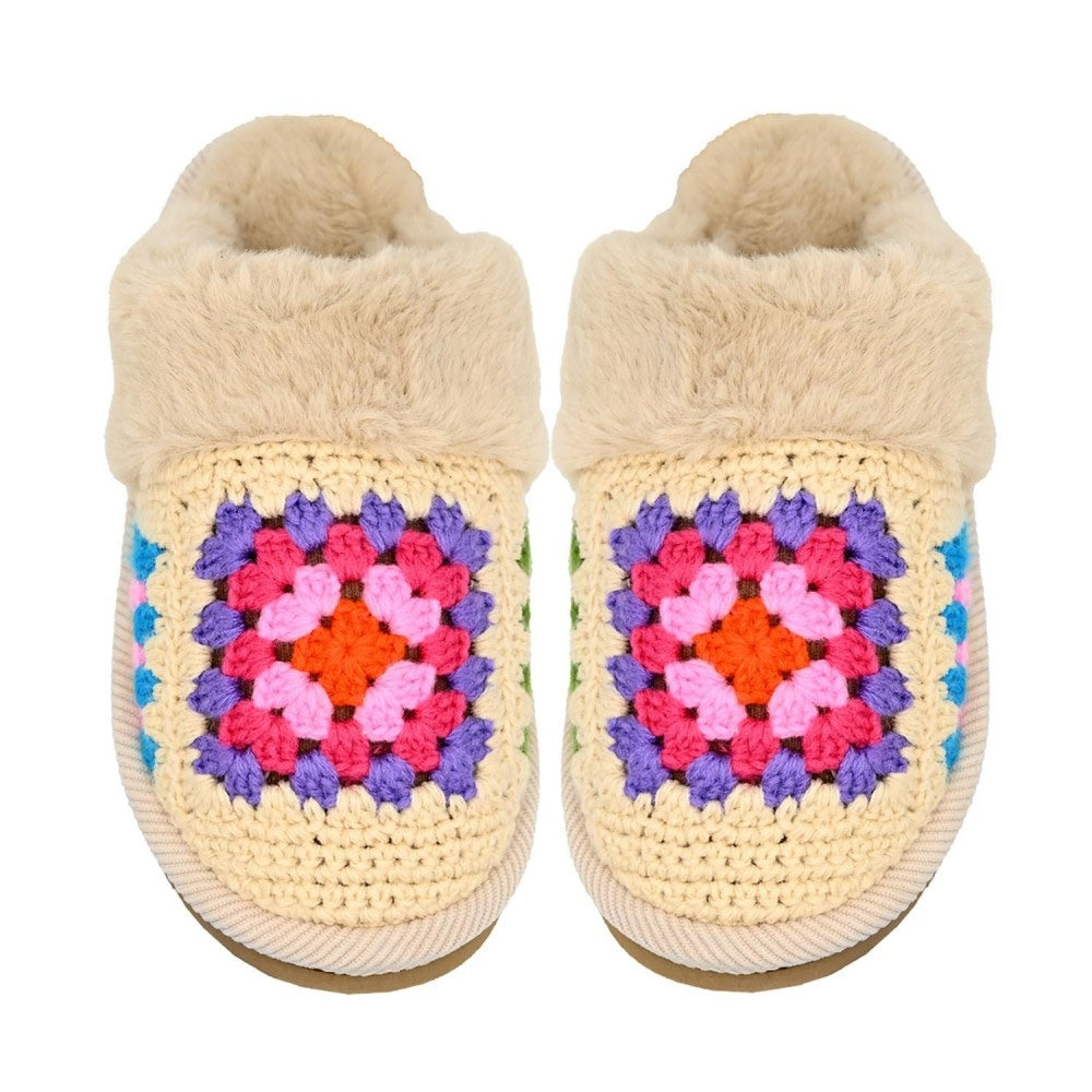 Crochet Granny Square Fur Cuff Slippers - Beige