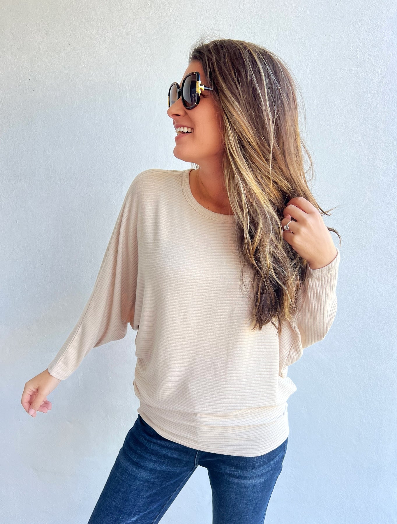 Ribbed Batwing Boat Neck Sweater in Sand Beige
