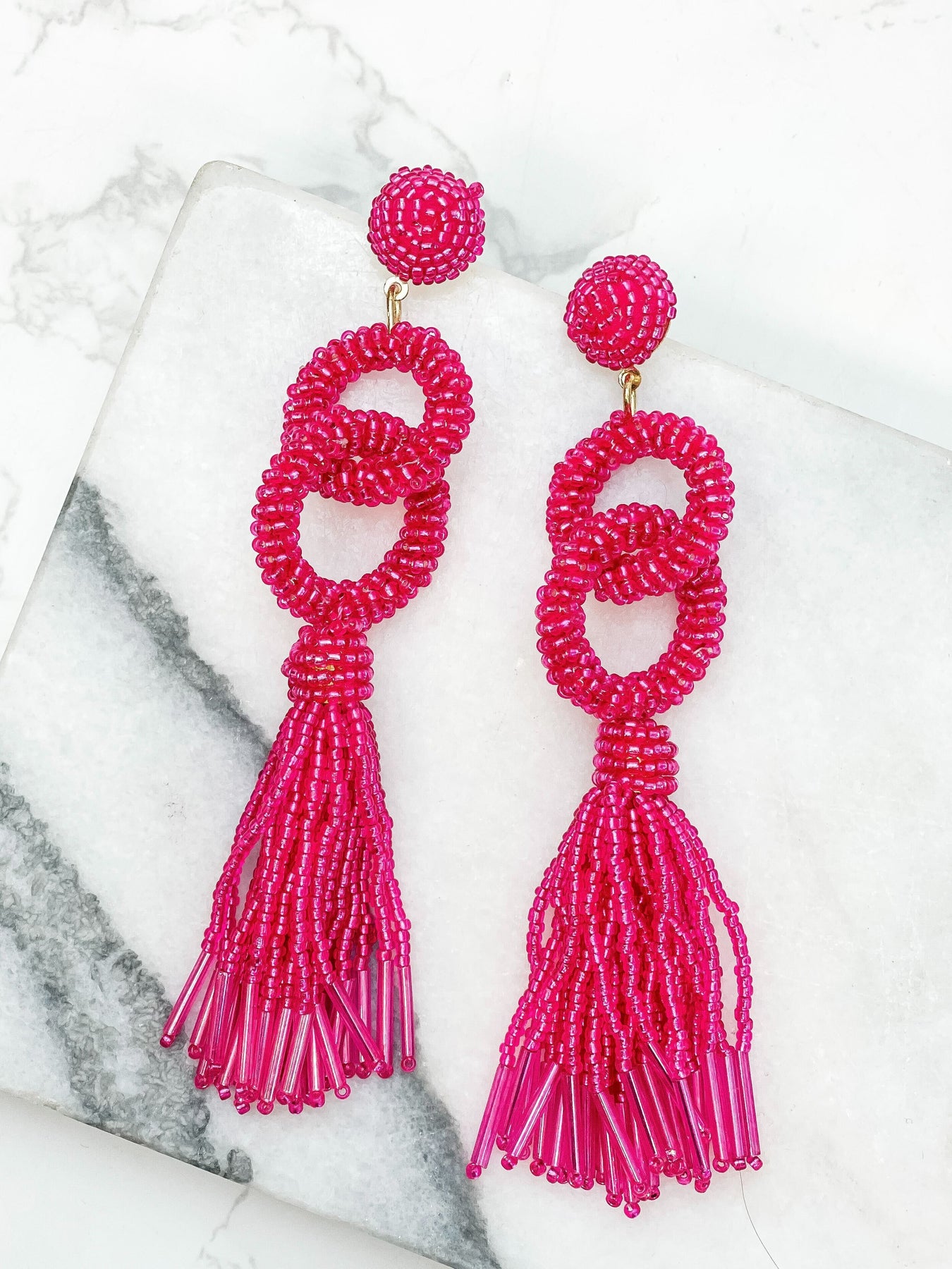 Seed Bead Linked Tassel Earrings - Hot Pink