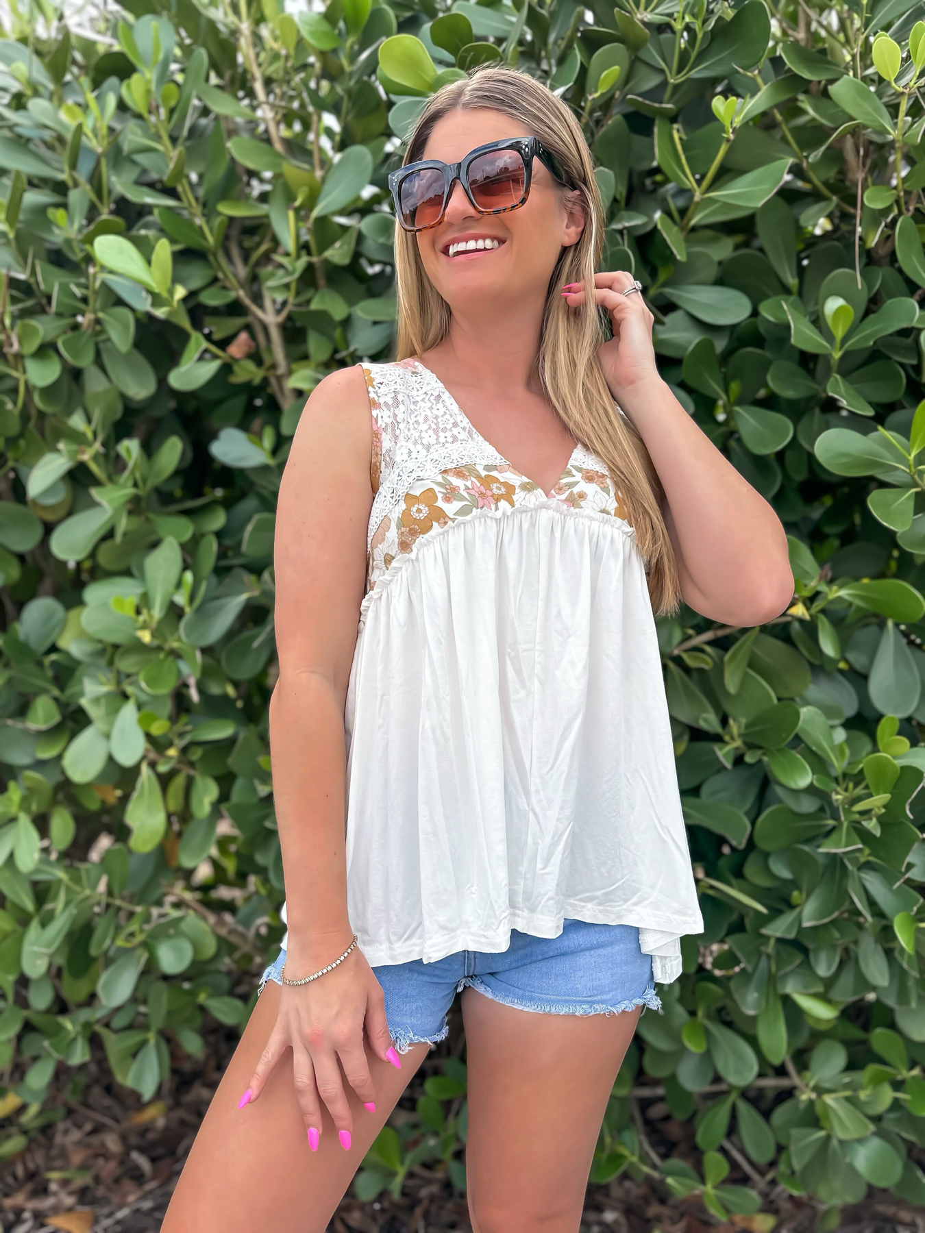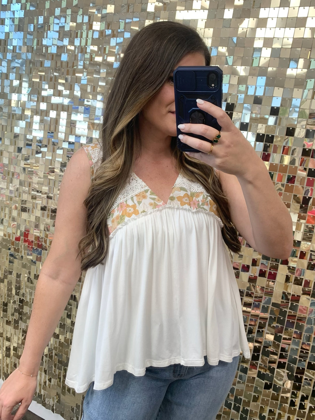 V-Neck A-Line Sleeveless Floral Top by POL - Off White