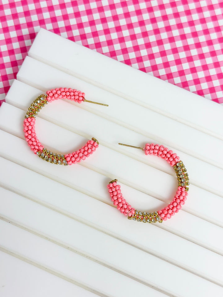 Seed Bead & Rhinestone Hoop Earrings - Pink