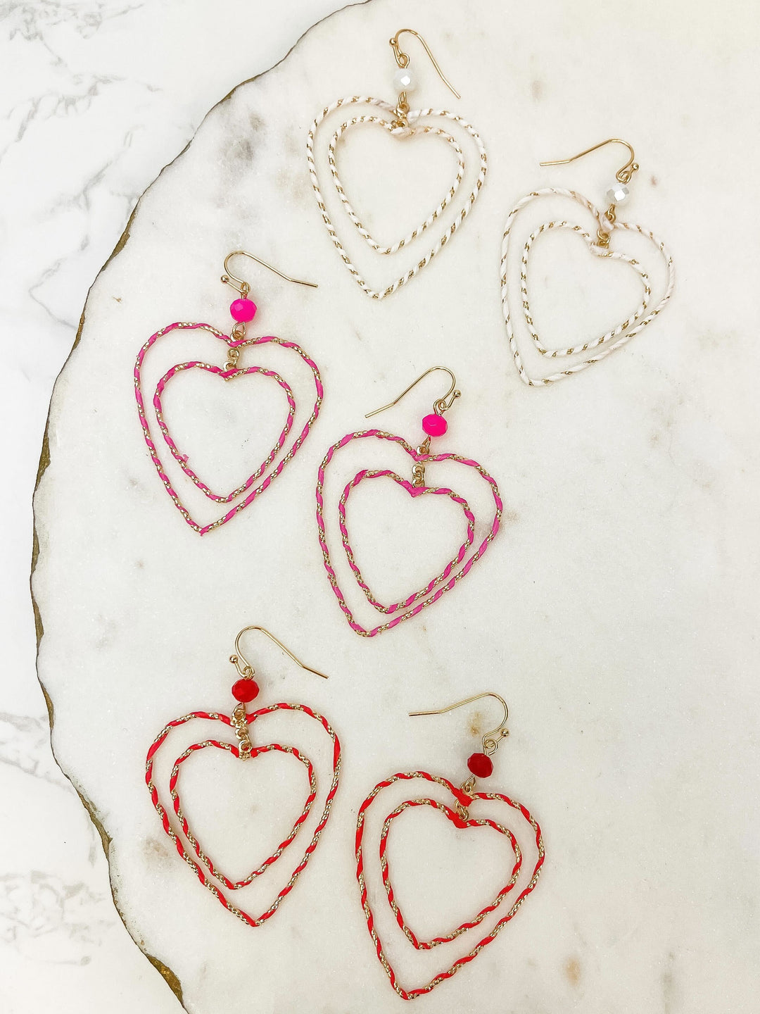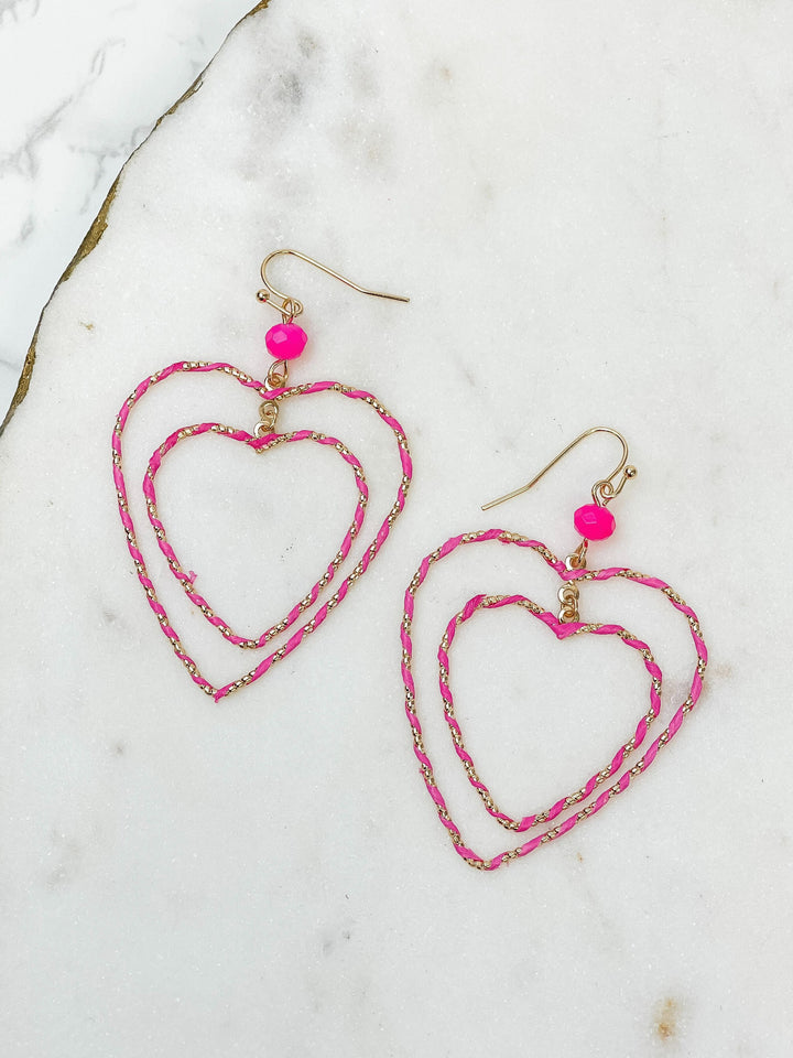 Wrapped Double Heart Dangle Earrings - Pink