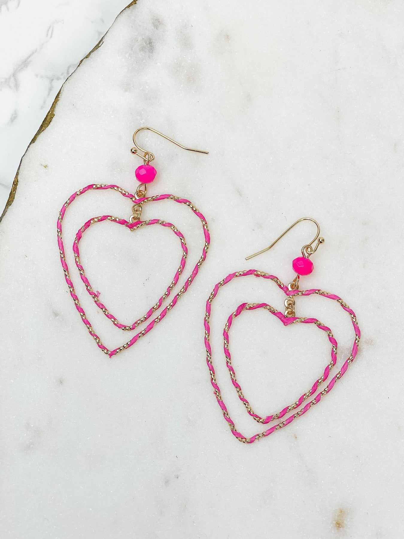 Introducing our stunning Wrapped Double Heart Dangle Earrings in Pink. These elegant earrings feature a playful heart dangle design that is sure to add a touch of fun to any outfit!