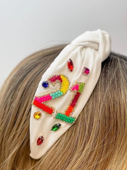 Celebrate your 21st birthday in style with this '21 Finally' Embellished Headband! This statement headpiece is designed to make your special day even more special with its beaded birthday number 21 surrounded by sparkly gems.